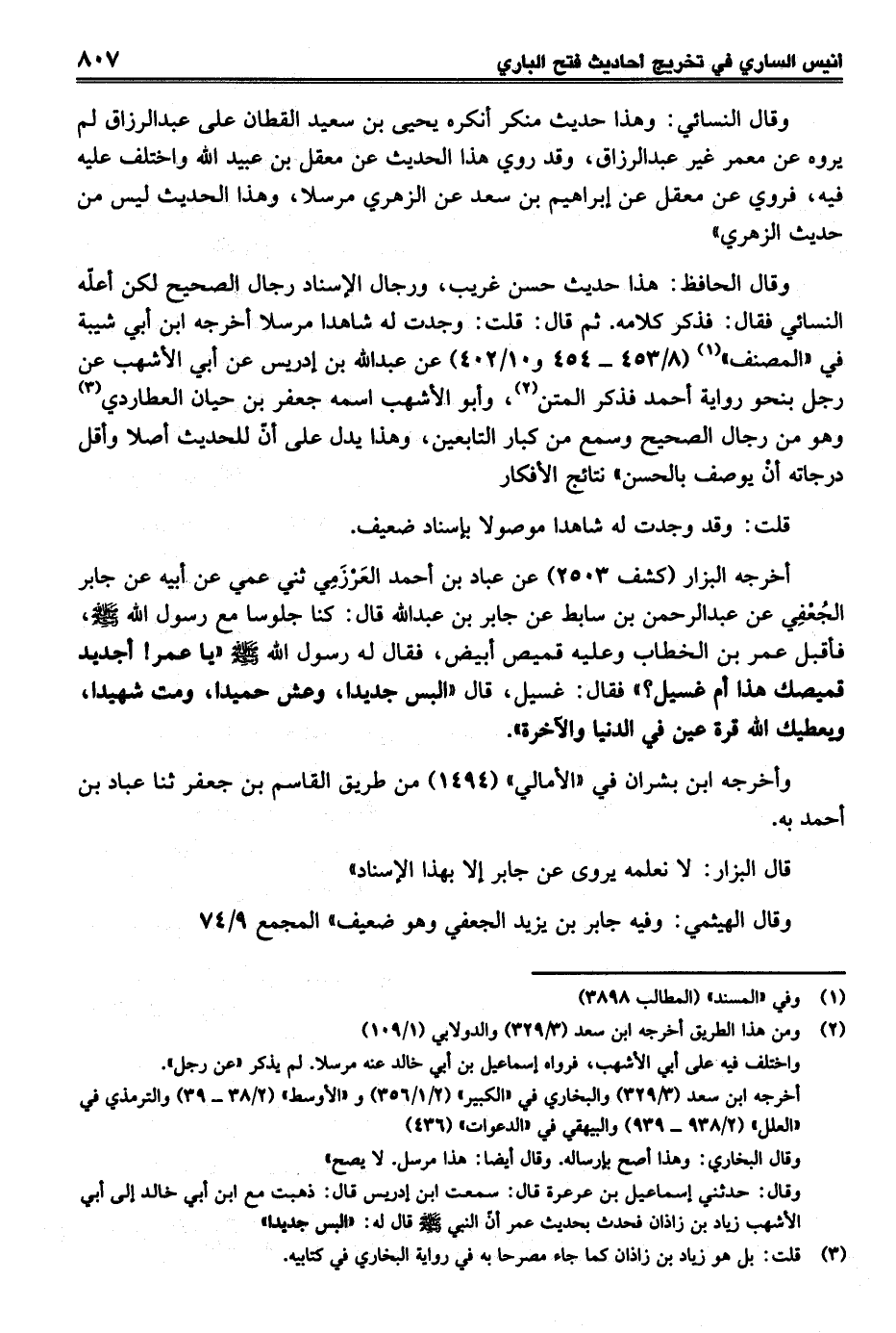 وقال الحافظ: هذا حديث حسن غريب، ورجال الإسناد رجال الصحيح لكن أعلّه النسائي فقال: فذكر كلامه. ثم قال: قلت: وجدت له شاهدا مرسلاً أخرجه ابن أبي شيبة في "المصنف" (¬1) (8/ 453 - 454 و 10/ 402) عن عبد الله بن إدريس عن أبي الأشهب عن رجل بنحو رواية أحمد فذكر المتن (¬2)، وأبو الأشهب اسمه جعفر بن حيان العطاردي (¬3) وهو من رجال الصحيح وسمع من كبار التابعين، وهذا يدل على أنّ للحديث أصلا وأقل درجاته أنْ يوصف بالحسن" نتائج الأفكار