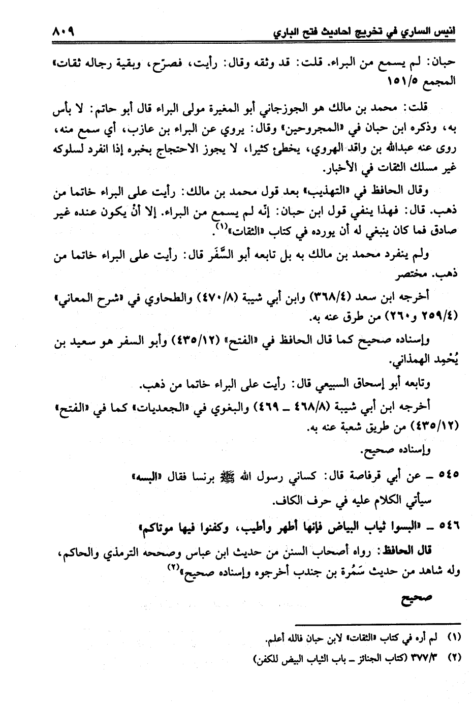 وقال الحافظ في "التهذيب" بعد قول محمد بن مالك: رأيت على البراء خاتما من ذهب. قال: فهذا ينفي قول ابن حبان: إنّه لم يسمع من البراء. إلا أنْ يكون عنده غير صادق فما كان ينبغي له أن يورده في كتاب "الثقات" (¬1).