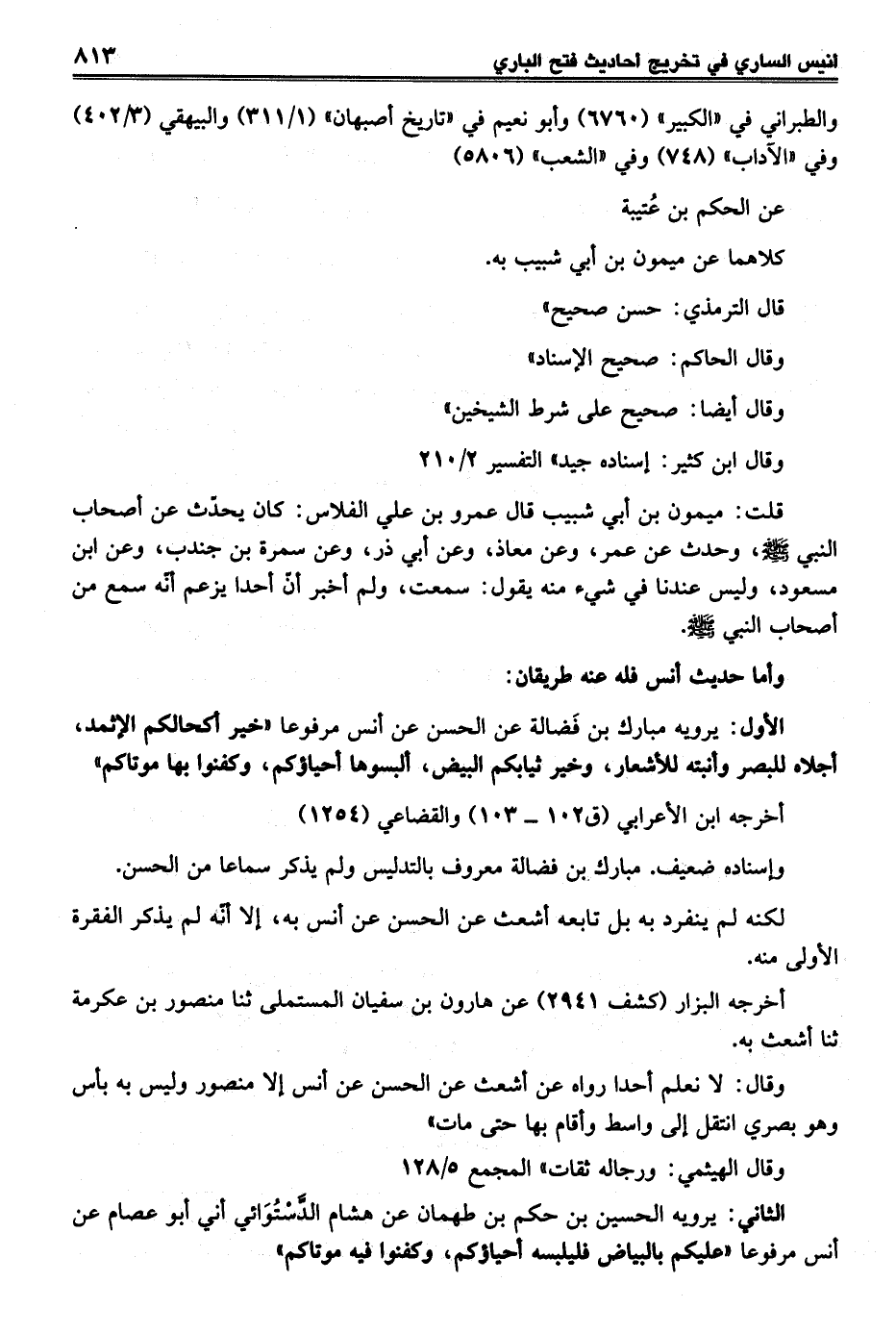 الأول: يرويه مبارك بن فَضالة عن الحسن عن أنس مرفوعاً "خير أكحالكم الإثمد، أجلاه للبصر وأنبته للأشعار، وخير ثيابكم البيض، ألبسوها أحياؤكم، وكفنوا بها موتاكم"