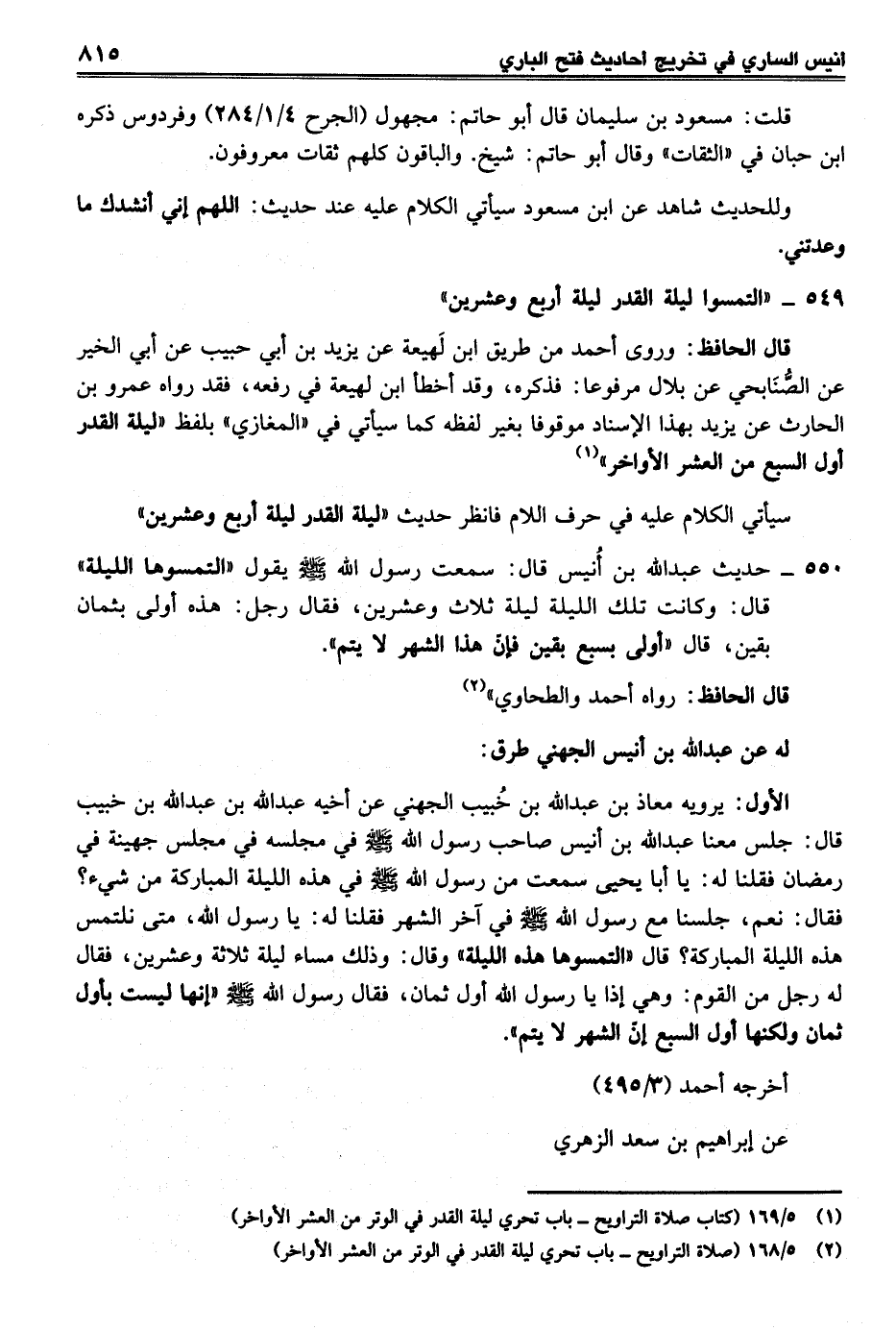 550 - حديث عبد الله بن أُنيس قال: سمعت رسول الله - صلى الله عليه وسلم - يقول "التمسوها الليلة" قال: وكانت تلك الليلة ليلة ثلاث وعشرين، فقال رجل: هذه أولى بثمان بقين، قال "أولى بسبع بقين فإنّ هذا الشهر لا يتم".