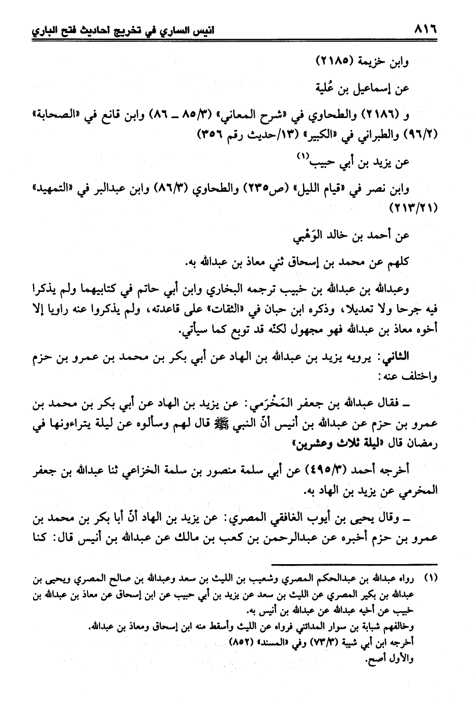 - وقال يحيى بن أيوب الغافقي المصري: عن يزيد بن الهاد أنّ أبا بكر بن محمد بن عمرو بن حزم أخبره عن عبد الرحمن بن كعب بن مالك عن عبد الله بن أنيس قال: كنا