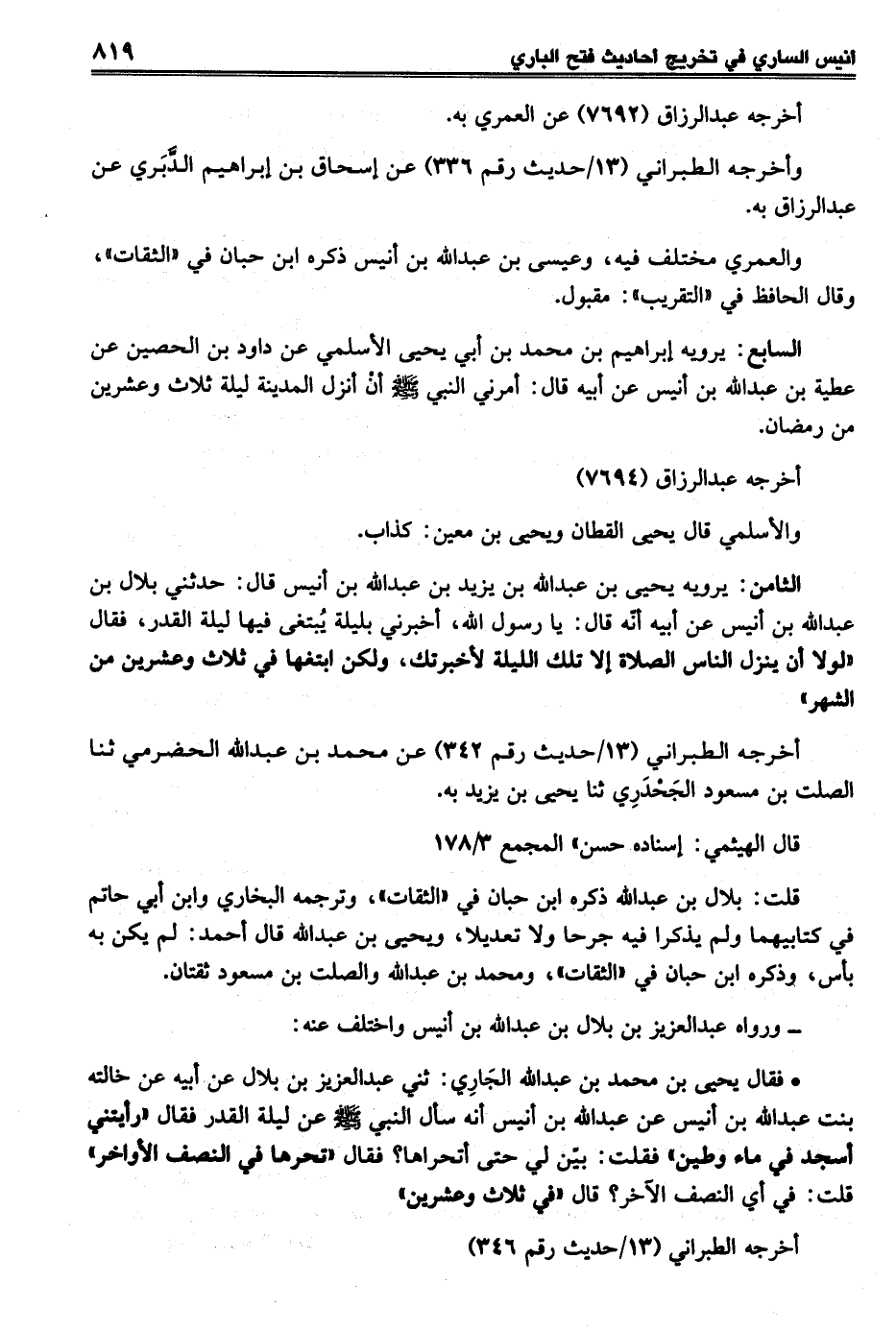 الثامن: يرويه يحيى بن عبد الله بن يزيد بن عبد الله بن أنيس قال: حدثني بلال بن عبد الله بن أنيس عن أبيه أنّه قال: يا رسول الله، أخبرني بليلة يُبتغى فيها ليلة القدر، فقال "لولا أن ينزل الناس الصلاة إلا تلك الليلة لأخبرتك، ولكن ابتغها في ثلاث وعشرين من الشهر"