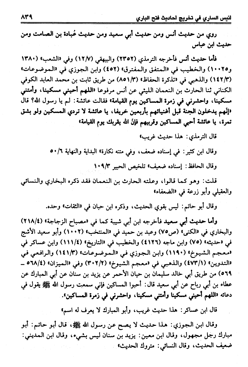 فأما حديث أنس فأخرجه الترمذي (2352) والبيهقي (7/ 12) وفي "الشعب" (1380 و 10025) والخطيب في "المتفق والمفترق" (452) وابن الجوزي في "الموضوعات" (3/ 142) والذهبي في "تذكرة الحفاظ" (3/ 851) من طريق ثابت بن محمد العابد الكوفي الكناني ثنا الحارث بن النعمان الليثي عن أنس مرفوعاً "اللهم أحيني مسكينا، وأمتني مسكينا، واحشرني في زمرة المساكين يوم القيامة" فقالت عائشة: لم يا رسول الله؟ قال "إنّهم يدخلون الجنة قبل أغنيائهم بأربعين خريفا، يا عائشة لا تردي المسكين ولو بشق تمرة، يا عائشة أحبي المساكين وقربيهم فإنّ الله يقربك يوم القيامة"