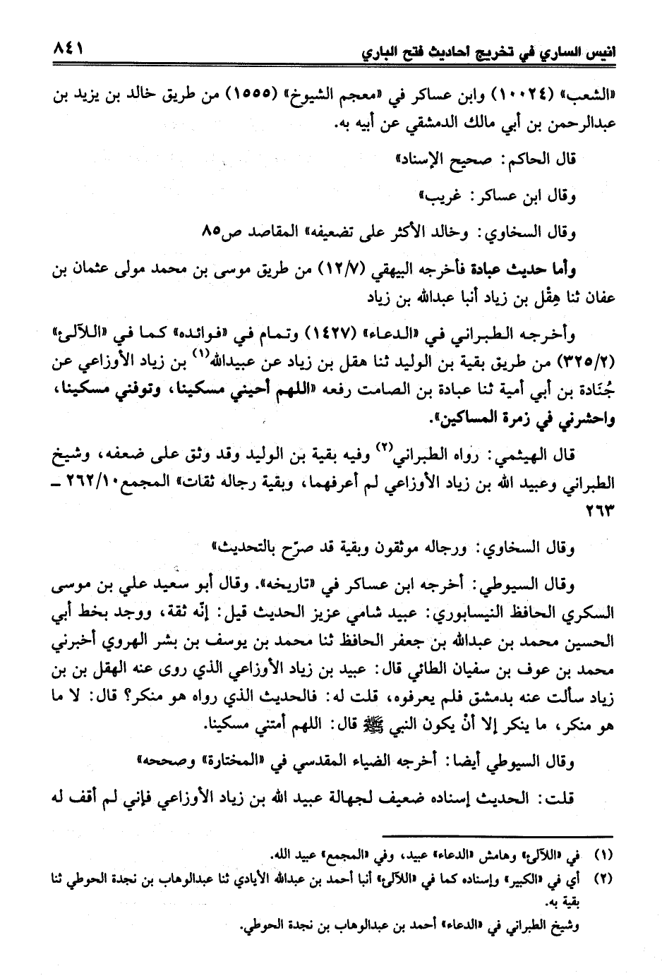 وقال السيوطي: أخرجه ابن عساكر في "تاريخه". وقال أبو سعيد علي بن موسى السكري الحافظ النيسابوري: عبيد شامي عزيز الحديث قيل: إنّه ثقة، ووجد بخط أبي الحسين محمد بن عبد الله بن جعفر الحافظ ثنا محمد بن يوسف بن بشر الهروي أخبرني محمد بن عوف بن سفيان الطائي قال: عبيد بن زياد الأوزاعي الذي روى عنه الهقل بن بن زياد سألت عنه بدمشق فلم يعرفوه، قلت له: فالحديث الذي رواه هو منكر؟ قال: لا ما هو منكر، ما ينكر إلا أنْ يكون النبي - صلى الله عليه وسلم - قال: اللهم أمتني مسكينا.