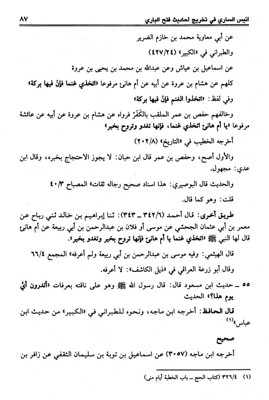 كلهم عن هشام بن عروة عن أبيه عن أم هانئ مرفوعا "اتخذي غنما فإنّ فيها بركة"