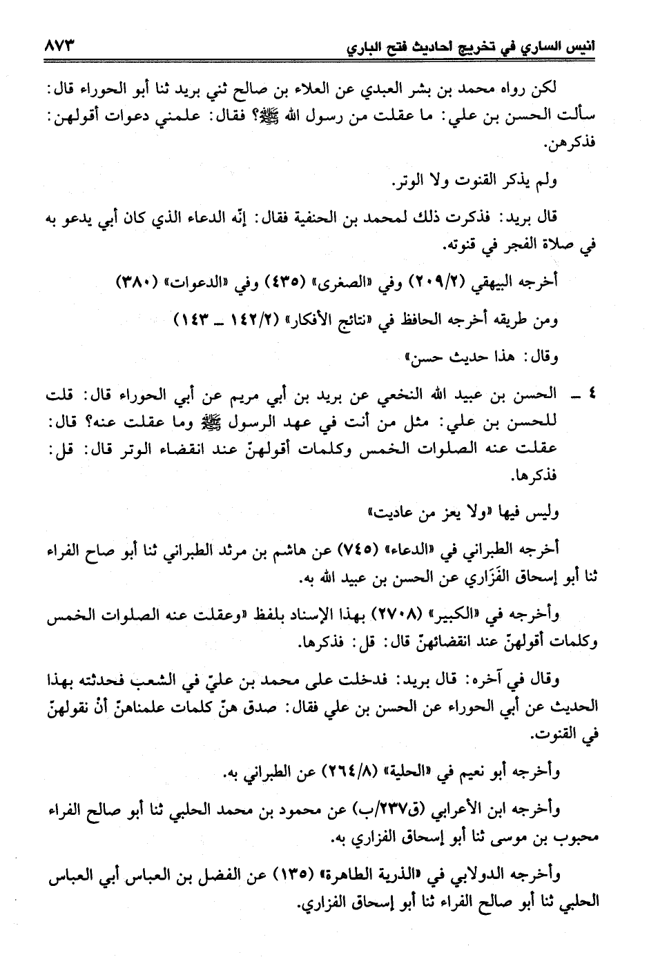 وقال في آخره: قال بريد: فدخلت على محمد بن عليّ في الشعب فحدثته بهذا الحديث عن أبي الحوراء عن الحسن بن علي فقال: صدق هنّ كلمات علمناهنّ أنْ نقولهنّ في القنوت.