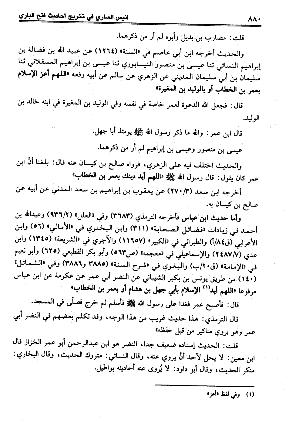 وأما حديث ابن عباس فأخرجه الترمذي (3683) وفي "العلل" (2/ 936) وعبد الله بن أحمد في زيادات "فضائل الصحابة" (311) وابن البختري في "الأمالي" (56) وابن الأعرابي (ق 84/ أ) والطبراني في "الكبير" (11657) والآجري في "الشريعة" (1345) وابن عدي (7/ 2487) والإسماعيلي في "معجمه" (ص 563) وأبو بكر القطيعي (625) وأبو نعيم في "الإمامة" (ق 20/ ب) والبغوي في "شرح السنة" (3885 و 3886) وفي "الشمائل" (140) من طريق يونس بن بكير الشيباني عن النضر أبي عمر عن عكرمة عن ابن عباس مرفوعاً "اللهم أيد (¬1) الإِسلام بأبي جهل بن هشام أو بعمر بن الخطاب"