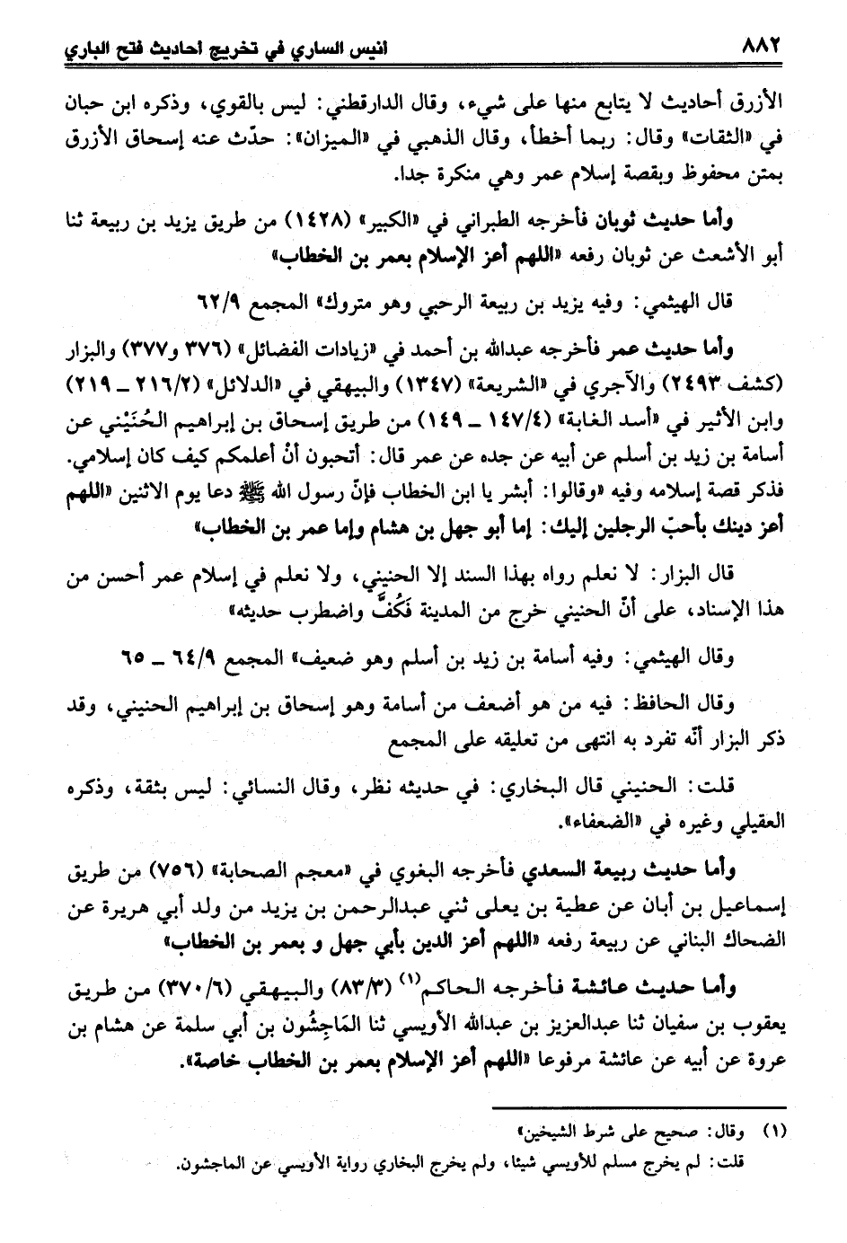 قال البزار: لا نعلم رواه بهذا السند إلا الحنيني، ولا نعلم في إسلام عمر أحسن من هذا الإسناد، على أنّ الحنيني خرج من المدينة فَكُفَّ واضطرب حديثه"