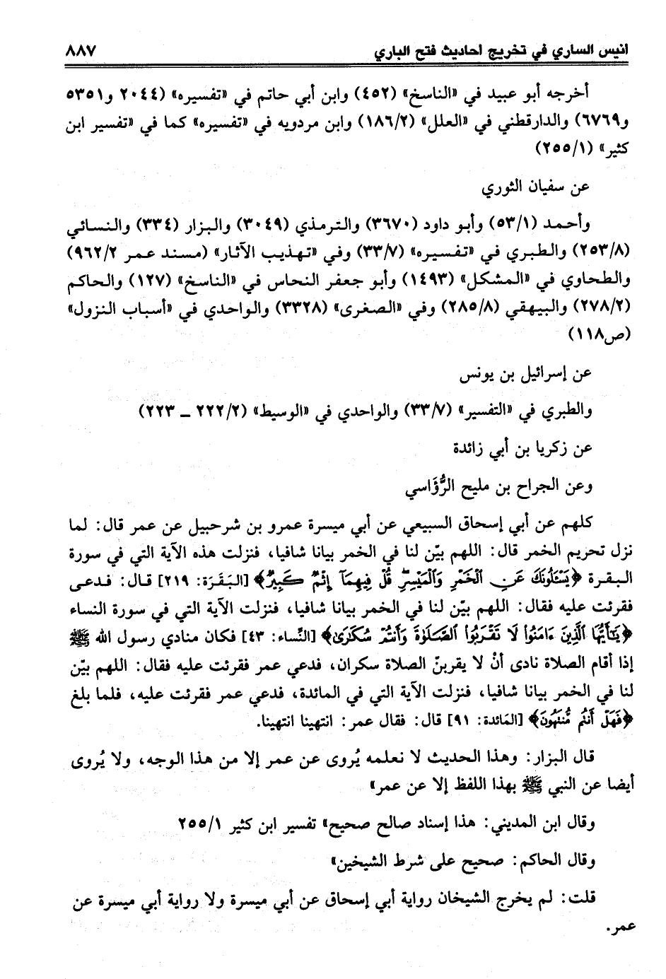 كلهم عن أبي إسحاق السبيعي عن أبي ميسرة عمرو بن شرحبيل عن عمر قال: لما نزل تحريم الخمر قال: اللهم بيّن لنا في الخمر بيانا شافيا، فنزلت هذه الآية التي في سورة البقرة {يَسْأَلُونَكَ عَنِ الْخَمْرِ وَالْمَيْسِرِ قُلْ فِيهِمَا إِثْمٌ كَبِيرٌ} [البَقَرَة: 219] قال: فدعى فقرئت عليه فقال: اللهم بيّن لنا في الخمر بيانا شافيا، فنزلت الآية التي في سورة النساء {يَا أَيُّهَا الَّذِينَ آمَنُوا لَا تَقْرَبُوا الصَّلَاةَ وَأَنْتُمْ سُكَارَى} [النَّساء: 43] فكان منادي رسول الله - صلى الله عليه وسلم - إذا أقام الصلاة نادى أنْ لا يقربنّ الصلاة سكران، فدعي عمر فقرئت عليه فقال: اللهم بيّن لنا في الخمر بيانا شافيا، فنزلت الآية التي في المائدة، فدعي عمر فقرئت عليه، فلما بلغ {فَهَلْ أَنْتُمْ مُنْتَهُونَ} [المَائدة: 91] قال: فقال عمر: انتهينا انتهينا.