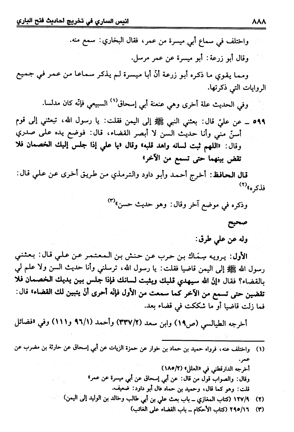 599 - عن عليّ قال: بعثني النبي - صلى الله عليه وسلم - إلى اليمن فقلت: يا رسول الله، تبعثني إلى قوم أسنّ مني وأنا حديث السن لا أبصر القضاء، قال: فوضع يده على صدري وقال: "اللهم ثبت لسانه واهد قلبه" وقال "يا علي إذا جلس إليك الخصمان فلا تقض بينهما حتى تسمع من الآخر"