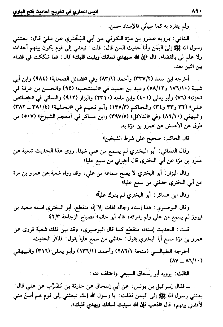 - فقال إسرائيل بن يونس: عن أبي إسحاق عن حارثة بن مُضَرِّب عن علي قال: بعثني رسول الله - صلى الله عليه وسلم - إلى اليمن فقلت: يا رسول الله إنك تبعثني إلى قوم هم أسنّ مني لأقضي بينهم، قال "اذهب فإنّ الله سيثبت لسانك ويهدي قلبك".