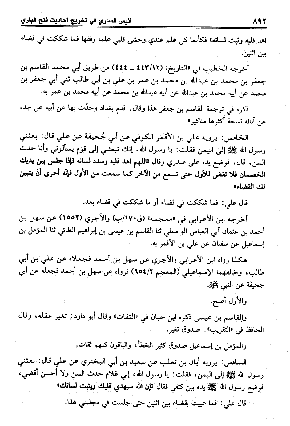 الخامس: يرويه علي بن الأقمر الكوفي عن أبي جُحيفة عن علي قال: بعثني رسول الله - صلى الله عليه وسلم - إلى اليمن فقلت: يا رسول الله، إنك تبعثني إلى قوم يسألوني وأنا حدث السن, قال، فوضع يده على صدري وقال "اللهم اهد قلبه وسدد لسانه فإذا جلس بين يديك الخصمان فلا تقض للأول حتى تسمع من الآخر كما سمعت من الأول فإنه أحرى أنْ يتبين لك القضاء"