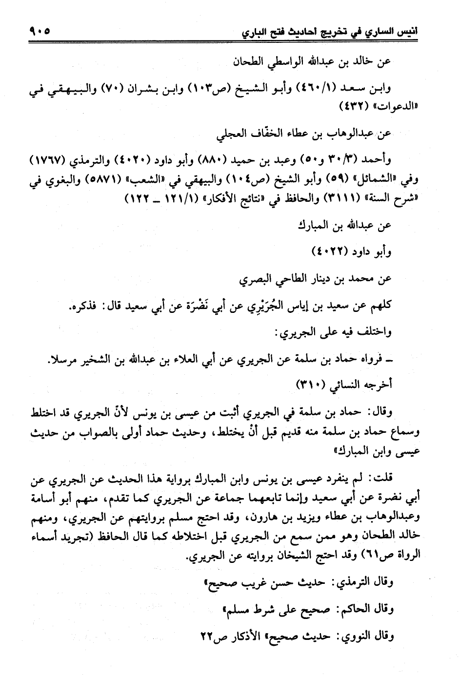 قلت: لم ينفرد عيسى بن يونس وابن المبارك برواية هذا الحديث عن الجريري عن أبي نضرة عن أبي سعيد وإنما تابعهما جماعة عن الجريري كما تقدم، منهم أبو أسامة وعبد الوهاب بن عطاء ويزيد بن هارون، وقد احتج مسلم بروايتهم عن الجريري، ومنهم خالد الطحان وهو ممن سمع من الجريري قبل اختلاطه كما قال الحافظ (تجريد أسماء الرواة ص 61) وقد احتج الشيخان بروايته عن الجريري.