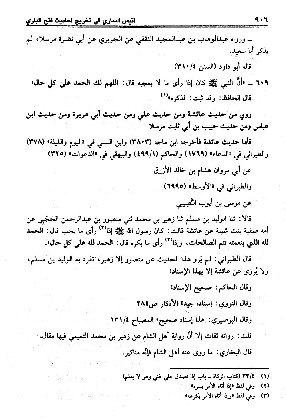 قالا: ثنا الوليد بن مسلم ثنا زهير بن محمَّد ثني منصور بن عبد الرحمن الحَجَبِي عن أمه صفية بنت شيبة عن عائشة قالت: كان رسول الله - صلى الله عليه وسلم - إذا (¬2) رأى ما يحب قال: الحمد لله الذي بنعمته تتم الصالحات، وإذا (¬3) رأى ما يكره قال: الحمد لله على كل حال".