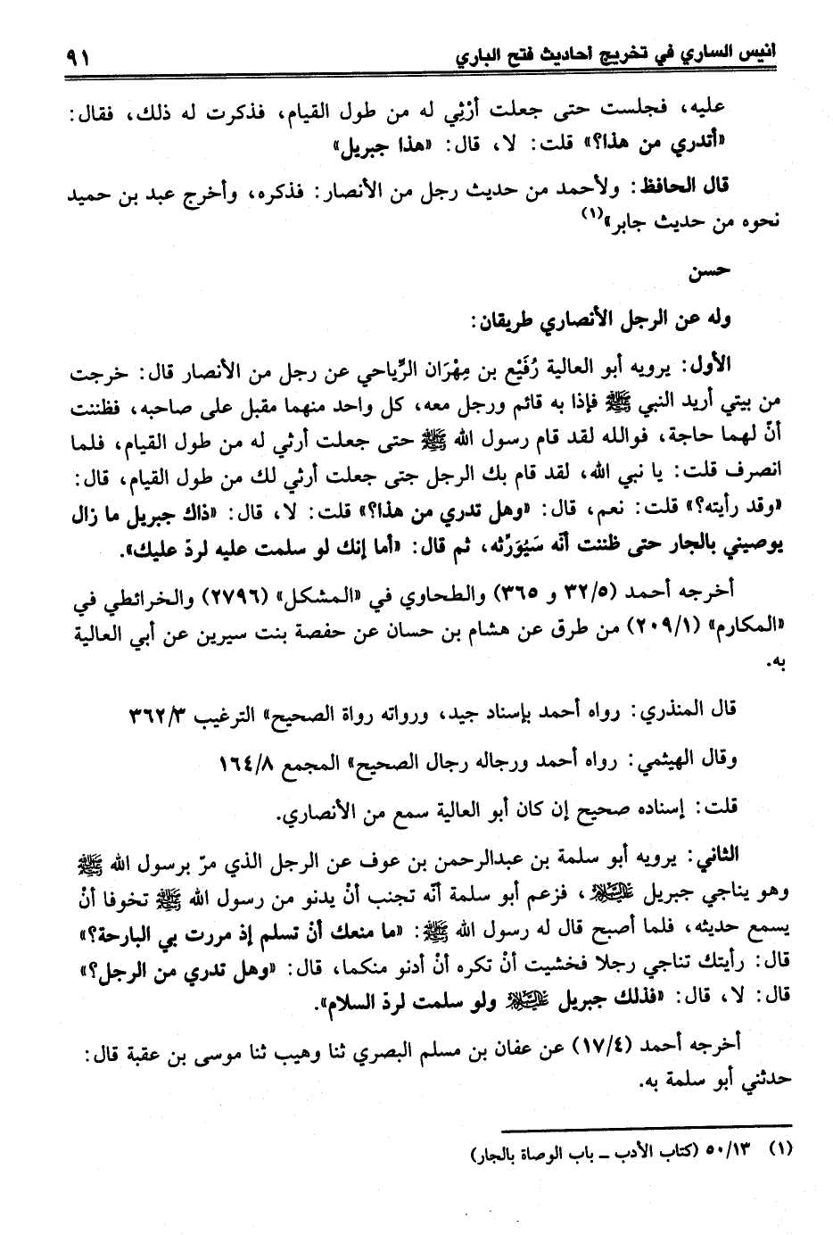 الأول: يرويه أبو العالية رُفَيْع بن مِهْرَان الرَّياحي عن رجل من الأنصار قال: خرجت من بيتي أريد النبي - صلى الله عليه وسلم - فإذا به قائم ورجل معه، كل واحد منهما مقبل على صاحبه، فظننت أنْ لهما حاجة، فوالله لقد قام رسول الله - صلى الله عليه وسلم - حتى جعلت أرثي له من طول القيام، فلما انصرف قلت: يا نبي الله، لقد قام بك الرجل حتى جعلت أرثي لك من طول القيام، قال: "وقد رأيته؟ " قلت: نعم، قال: "وهل تدري من هذا؟ " قلت: لا، قال: "ذاك جبريل ما زال يوصيني بالجار حتى ظننت أنّه سَيُوَرثه، ثم قال: "أما إنك لو سلمت عليه لردّ عليك".