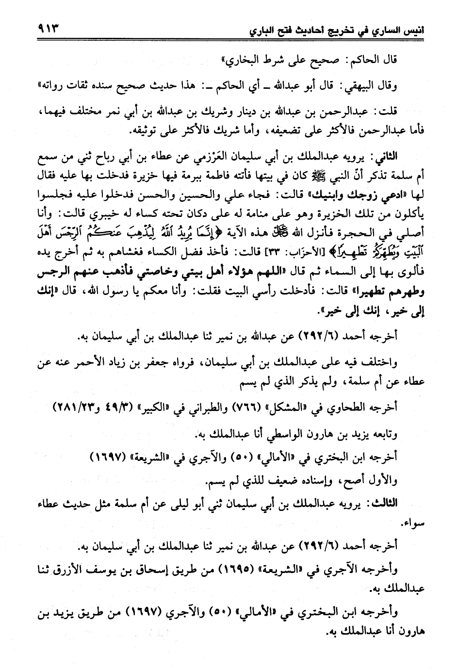 الثاني: يرويه عبد الملك بن أبي سليمان العَرْزمي عن عطاء بن أبي رباح ثني من سمع أم سلمة تذكر أنّ النبي - صلى الله عليه وسلم - كان في بيتها فأتته فاطمة ببرمة فيها خزيرة فدخلت بها عليه فقال لها "ادعي زوجك وابنيك" قالت: فجاء علي والحسين والحسن فدخلوا عليه فجلسوا يأكلون من تلك الخزيرة وهو على منامة له على دكان تحته كساء له خيبري قالت: وأنا أصلي في الحجرة فأنزل الله - عز وجل - هذه الآية {إِنَّمَا يُرِيدُ اللَّهُ لِيُذْهِبَ عَنْكُمُ الرِّجْسَ أَهْلَ الْبَيْتِ وَيُطَهِّرَكُمْ تَطْهِيرًا} [الأحزَاب: 33] قالت: فأخذ فضل الكساء فغشاهم به ثم أخرج يده فألوى بها إلى السماء ثم قال "اللهم هؤلاء أهل بيتي وخاصتي فأذهب عنهم الرجس وطهرهم تطهيرا" قالت: فأدخلت رأسي البيت فقلت: وأنا معكم يا رسول الله، قال "إنك إلى خير، إنك إلى خير".