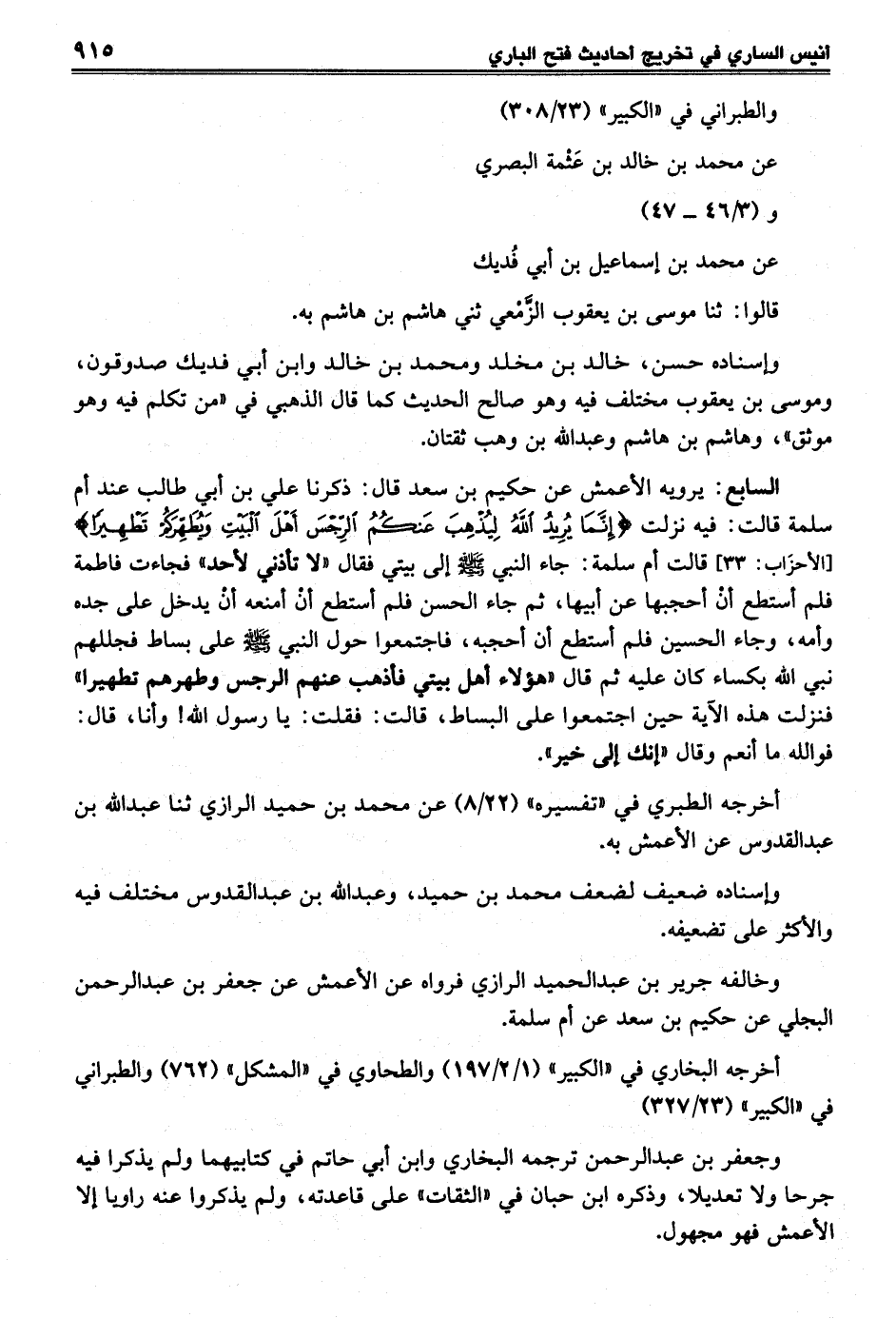 السابع: يرويه الأعمش عن حكيم بن سعد قال: ذكرنا علي بن أبي طالب عند أم سلمة قالت: فيه نزلت {إِنَّمَا يُرِيدُ اللَّهُ لِيُذْهِبَ عَنْكُمُ الرِّجْسَ أَهْلَ الْبَيْتِ وَيُطَهِّرَكُمْ تَطْهِيرًا} [الأحزَاب: 33] قالت أم سلمة: جاء النبي - صلى الله عليه وسلم - إلى بيتي فقال "لا تأذني لأحد" فجاءت فاطمة فلم أستطع أنْ أحجبها عن أبيها، ثم جاء الحسن فلم أستطع أنْ أمنعه أنْ يدخل على جده وأمه، وجاء الحسين فلم أستطع أن أحجبه، فاجتمعوا حول النبي - صلى الله عليه وسلم - على بساط فجللهم نبي الله بكساء كان عليه ثم قال "هؤلاء أهل بيتي فأذهب عنهم الرجس وطهرهم تطهيرا" فنزلت هذه الآية حين اجتمعوا على البساط، قال: فقلت: يا رسول الله! وأنا، قال: فوالله ما أنعم وقال "إنك إلى خير".