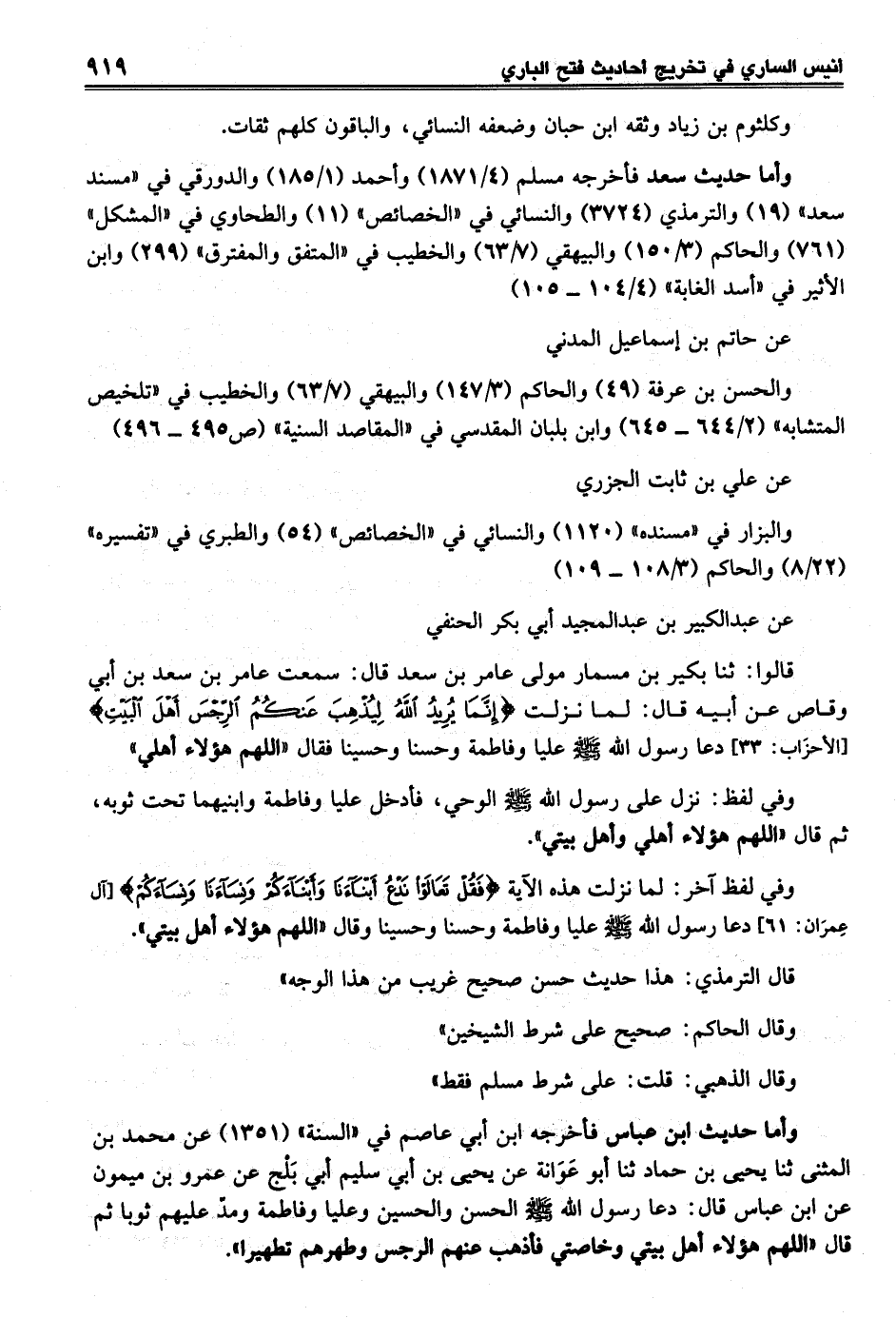 قالوا: ثنا بكير بن مسمار مولى عامر بن سعد قال: سمعت عامر بن سعد بن أبي وقاص عن أبيه قال: لما نزلت {إِنَّمَا يُرِيدُ اللَّهُ لِيُذْهِبَ عَنْكُمُ الرِّجْسَ أَهْلَ الْبَيْتِ} [الأحزَاب: 33] دعا رسول الله - صلى الله عليه وسلم - عليا وفاطمة وحسنا وحسينا فقال "اللهم هؤلاء أهلي"