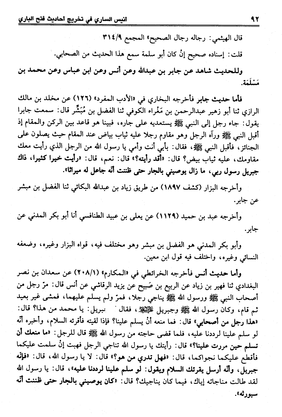 وأما حديث أنس فأخرجه الخرائطي في "المكارم" (1/ 208) عن سعدان بن نصر البغدادي ثنا فهير بن زياد عن الربيع بن صَبيح عن يزيد الرقاشي عن أنس قال: مرّ رجل من أصحاب النبي - صلى الله عليه وسلم - ورسول الله - صلى الله عليه وسلم - يناجي رجلا، فمرّ ولم يسلم عليهما، فمشى غير بعيد ثم قام، وكان رسول الله - صلى الله عليه وسلم - وجبريل - عليه السلام -، فقال جبريل: يا محمد من هذا؟ قال: "هذا رجل من أصحابي" قال: فما منعه أنْ يسلم علينا؟ فإذا لقيته فأقرئه السلام، وأخبره أنّه لو سلم علينا لرددنا عليه، فلما قضى حاجته من رسول الله - صلى الله عليه وسلم - قال للرجل: "ما منعك أن تسلم حين مررت علينا؟ " قال: رأيتك يا رسول الله تناجي الرجل فهبت إنْ سلمت عليكما فأقطع عليكما نجواكما، قال: "فهل تدري من هو؟ " قال: لا يا رسول الله، قال: "فإنّه جبريل، وأنّه أرسل يقرئك السلام ويقول: لو سلم علينا لرددنا عليه" قال: يا رسول الله لقد طالت مناجاته إياك، فيما كان يناجيك؟ قال: "كان يوصيني بالجار حتى ظننت أنّه سيورثه".