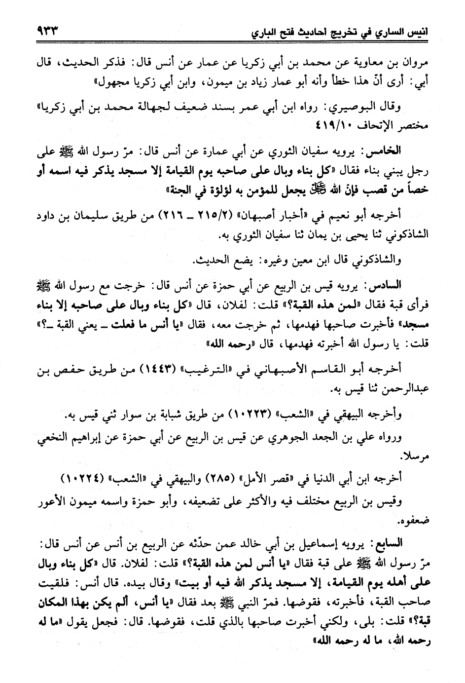 الخامس: يرويه سفيان الثوري عن أبي عمارة عن أنس قال: مرّ رسول الله - صلى الله عليه وسلم - على رجل يبني بناء فقال "كل بناء وبال على صاحبه يوم القيامة إلا مسجد يذكر فيه اسمه أو خصاً من قصب فإن الله عز وجل يجعل للمؤمن به لؤلؤة في الجنة"