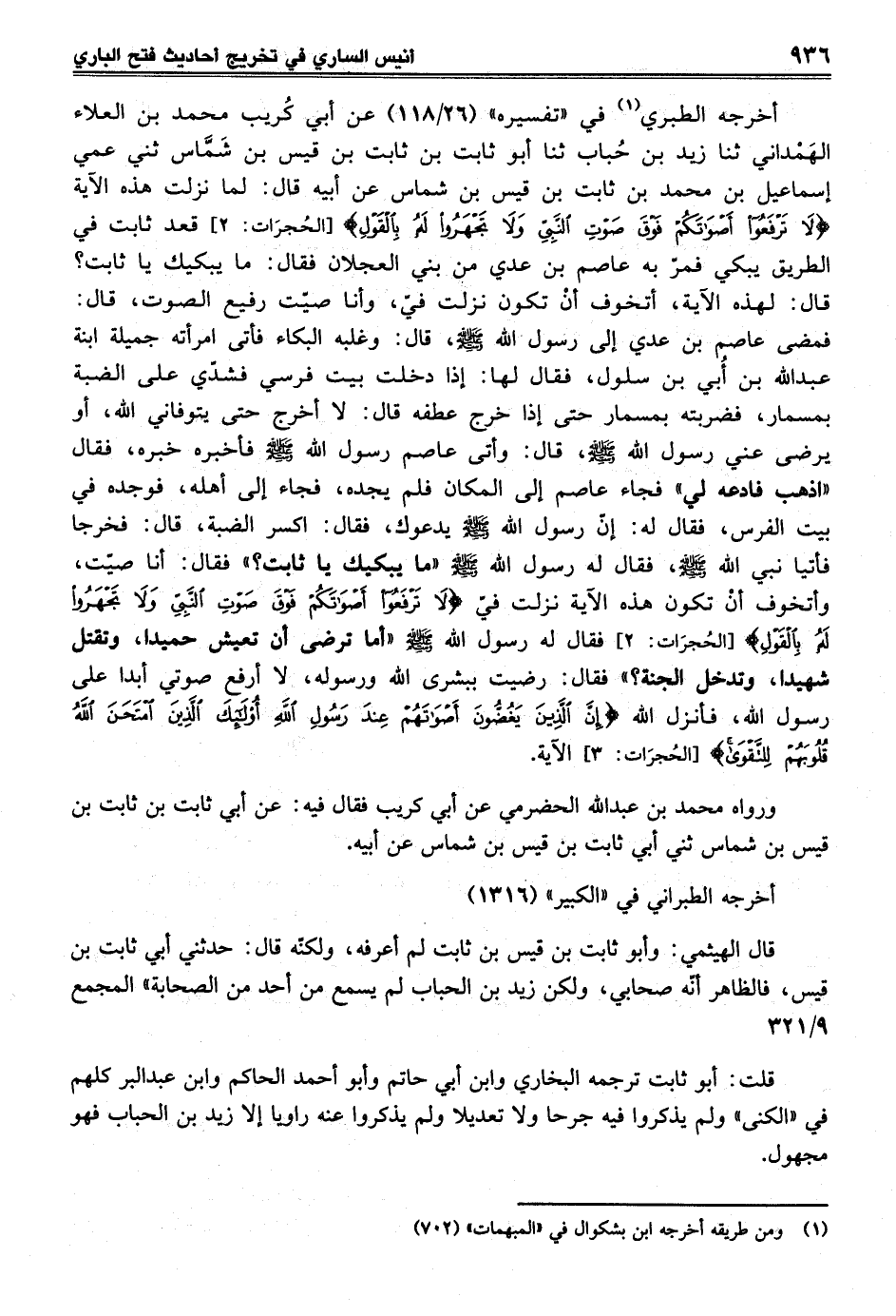 أخرجه الطبري (¬1) في "تفسيره" (26/ 118) عن أبي كُريب محمَّد بن العلاء الهَمْداني ثنا زيد بن حُباب ثنا أبو ثابت بن ثابت بن قيس بن شَمَّاس ثني عمي إسماعيل بن محمَّد بن ثابت بن قيس بن شماس عن أبيه قال: لما نزلت هذه الآية {لَا تَرْفَعُوا أَصْوَاتَكُمْ فَوْقَ صَوْتِ النَّبِيِّ وَلَا تَجْهَرُوا لَهُ بِالْقَوْلِ} [الحجرات: 2] قعد ثابت في الطريق يبكي فمرّ به عاصم بن عدي في بني العجلان فقال: ما يبكيك يا ثابت؟ قال: لهذه الآية، أتخوف أنْ تكون نزلت في، وأنا صيّت رفيع الصوت، قال: فمضى عاصم بن عدي إلى رسول الله - صلى الله عليه وسلم -، قال: وغلبه البكاء فأتى امرأته جميلة ابنة عبد الله بن أُبي بن سلول، فقال لها: إذا دخلت بيت فرسي فشدّي على الضبة بمسمار، فضربته بمسمار حتى إذا خرج عطفه قال: لا أخرج حتى يتوفاني الله، أو يرضى عني رسول الله - صلى الله عليه وسلم -، قال: وأتى عاصم رسول الله - صلى الله عليه وسلم - فأخبره خبره، فقال "اذهب فادعه لي" فجاء عاصم إلى المكان فلم يجده، فجاء إلى أهله، فوجده في بيت الفرس، فقال له: إن رسول الله - صلى الله عليه وسلم - يدعوك، فقال: اكسر الضبة، قال: فخرجا فأتيا نبي الله - صلى الله عليه وسلم -، فقال له رسول الله - صلى الله عليه وسلم -"ما يبكيك يا ثابت؟ " فقال: أنا صيّت، وأتخوف أنْ تكون هذه الآية نزلت فى {لَا تَرْفَعُوا أَصْوَاتَكُمْ فَوْقَ صَوْتِ النَّبِيِّ وَلَا تَجْهَرُوا لَهُ بِالْقَوْلِ} [الحجرات: 2] فقال له رسول الله - صلى الله عليه وسلم - "أما ترضى أن تعيش حميدا، وتقتل شهيدا، وتدخل الجنة؟ " فقال: رضيت ببشرى الله ورسوله، لا أرفع صوتي أبدا على رسول الله، فأنزل الله {إِنَّ الَّذِينَ يَغُضُّونَ أَصْوَاتَهُمْ عِنْدَ رَسُولِ اللَّهِ أُولَئِكَ الَّذِينَ امْتَحَنَ اللَّهُ قُلُوبَهُمْ لِلتَّقْوَى} [الحجرات: 3] الآية.