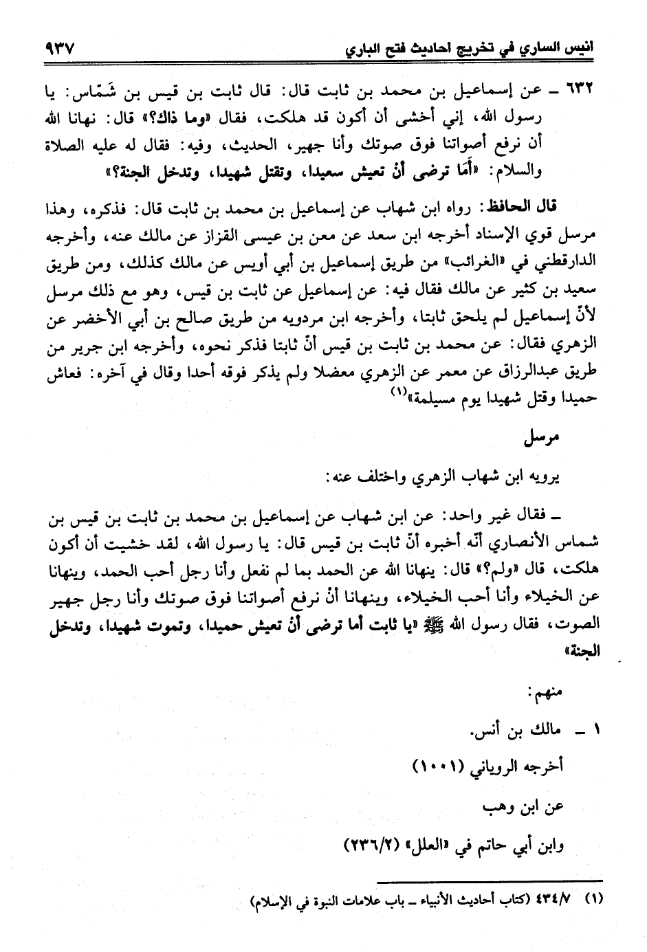 632 - عن إسماعيل بن محمَّد بن ثابت قال: قال ثابت بن قيس بن شَمَّاس: يا رسول الله، إني أخشى أن أكون قد هلكت، فقال "وما ذاك؟ " قال: نهانا الله أن نرفع أصواتنا فوق صوتك وأنا جهير، الحديث، وفيه: فقال له عليه الصلاة والسلام: "أَمَا ترضى أن تعيش سعيدا، وتقتل شهيدا، وتدخل الجنة؟ "