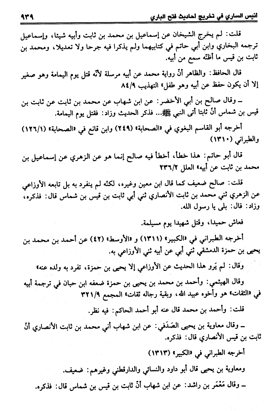 قلت: لم يخرج الشيخان عن إسماعيل بن محمَّد بن ثابت وأبيه شيئاً، وإسماعيل ترجمه البخاري وابن أبي حاتم في كتابيهما ولم يذكرا فيه جرحاً ولا تعديلا، ومحمد بن ثابت بن قيس ما أظنّه سمع من أبيه.