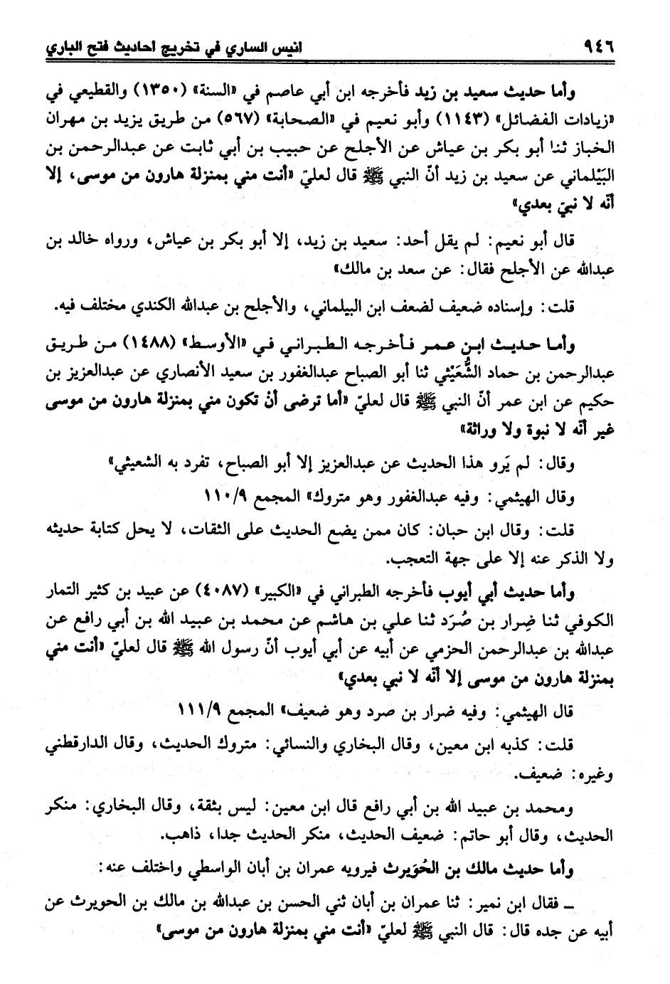 وأما حديث سعيد بن زيد فأخرجه ابن أبي عاصم في "السنة" (1350) والقطيعي في "زيادات الفضائل" (1143) وأبو نعيم في "الصحابة" (567) من طريق يزيد بن مهران الخباز ثنا أبو بكر بن عياش عن الأجلح عن حبيب بن أبي ثابت عن عبد الرحمن بن البَيْلمانى عن سعيد بن زيد أن النبي - صلى الله عليه وسلم - قال لعلي "أنت مني بمنزلة هارون من موسى، إلا أنه لا نبيّ بعدي"