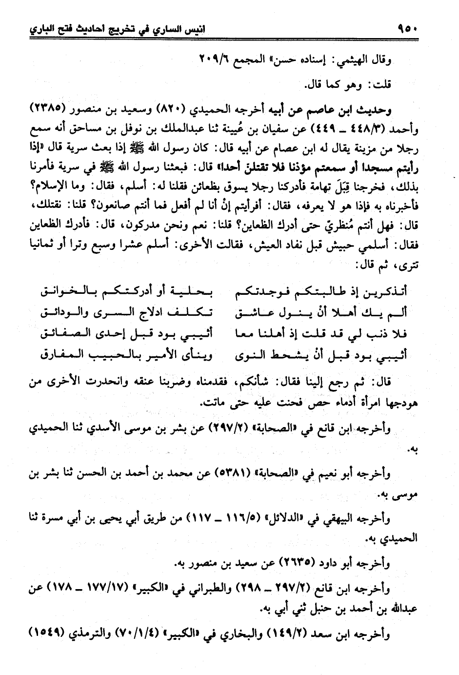 وحديث ابن عاصم عن أبيه أخرجه الحميدي (820) وسعيد بن منصور (2385) وأحمد (3/ 448 - 449) عن سفيان بن عُيينة ثنا عبد الملك بن نوفل بن مساحق أنه سمع رجلاً من مزينة يقال له ابن عصام عن أبيه قال: كان رسول الله - صلى الله عليه وسلم - إذا بعث سرية قال "إذا رأيتم مسجداً أو سمعتم مؤذنا فلا تقتلن أحدا" قال: فبعثنا رسول الله - صلى الله عليه وسلم - في سرية فأمرنا بذلك، فخرجنا قِبَلَ تهامة فأدركنا رجلاً يسوق بظعائن فقلنا له: أسلم، فقال: وما الإِسلام؟ فأخبرناه به فإذا هو لا يعرفه، فقال: أفرأيتم إنْ أنا لم أفعل فما أنتم صانعون؟ قلنا: نقتلك، قال: فهل أنتم مُنظريْ حتى أدرك الظعاين؟ قلنا: نعم ونحن مدركون، قال: فأدرك الظعاين فقال: أسلمي حبيش قبل نفاد العيش، فقالت الأخرى: أسلم عشرا وسبع وترا أو ثمانيا تترى، ثم قال: