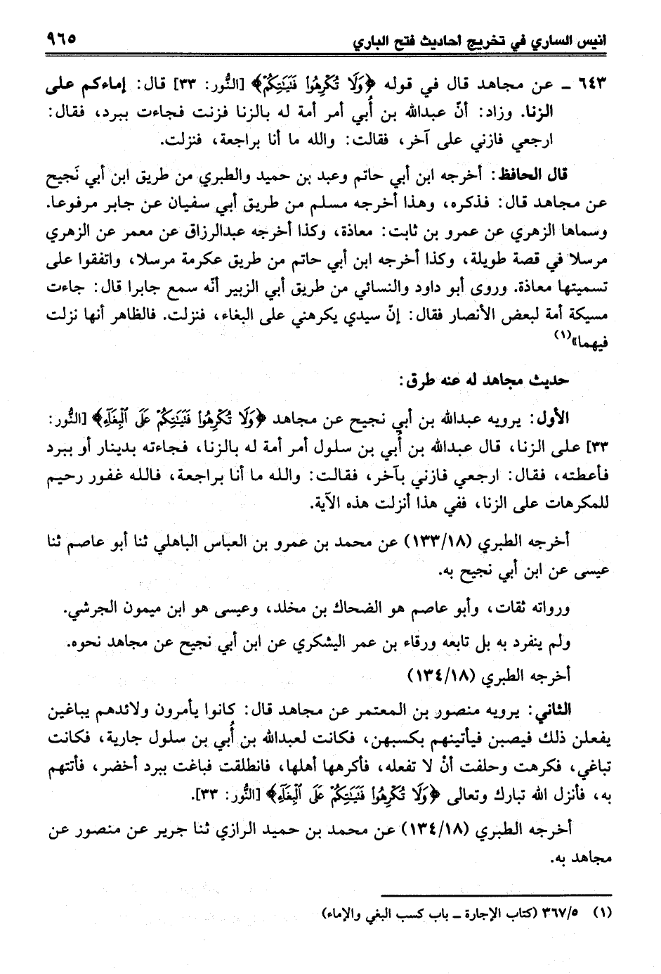 643 - عن مجاهد قال في قوله {وَلَا تُكْرِهُوا فَتَيَاتِكُمْ} [النور: 33] قال: إماءكم على الزنا. وزاد: أنّ عبد الله بن أُبي أمر أمة له بالزنا فزنت فجاءت ببرد، فقال: ارجعي فازني على آخر، فقالت: والله ما أنا براجعة، فنزلت.