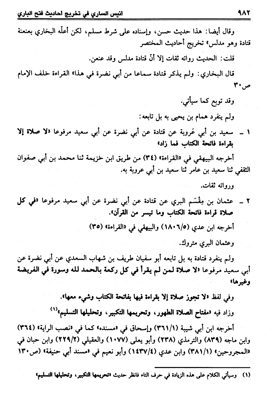 1 - سعيد بن أبي عَروبة عن قتادة عن أبي نضرة عن أبي سعيد مرفوعاً "لاصلاة إلا بقراءة فاتحة الكتاب فما زاد"