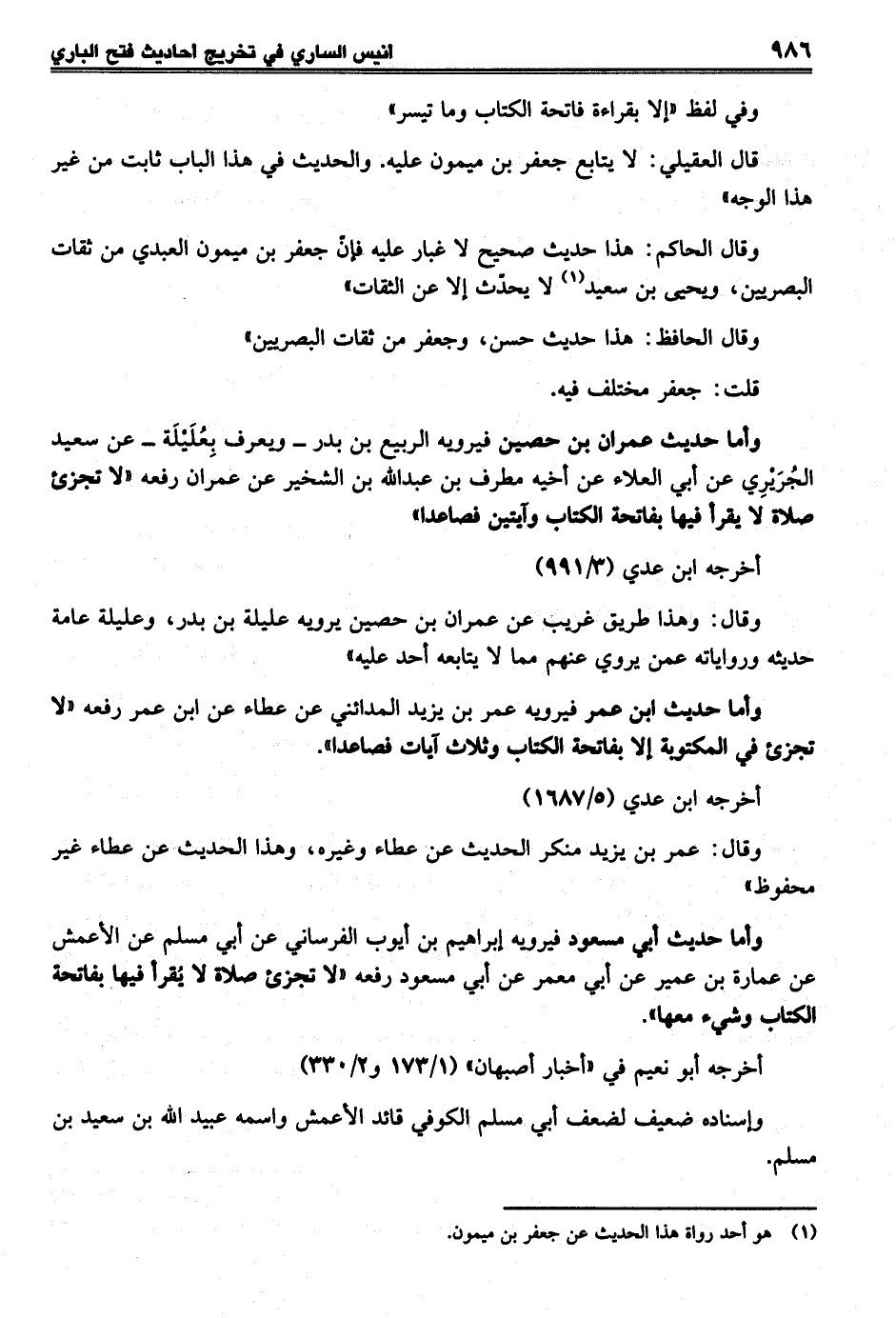 وأما حديث عمران بن حصين فيرويه الربيع بن بدر- ويعرت بِعُلَيْلَة- عن سعيد الجُرَيْرِي عن أبي العلاء عن أخيه مطرف بن عبد الله بن الشخير عن عمران رفعه "لا تجزئ صلاة لا يقرأ فيها بفاتحة الكتاب وآيتين فصاعدا"