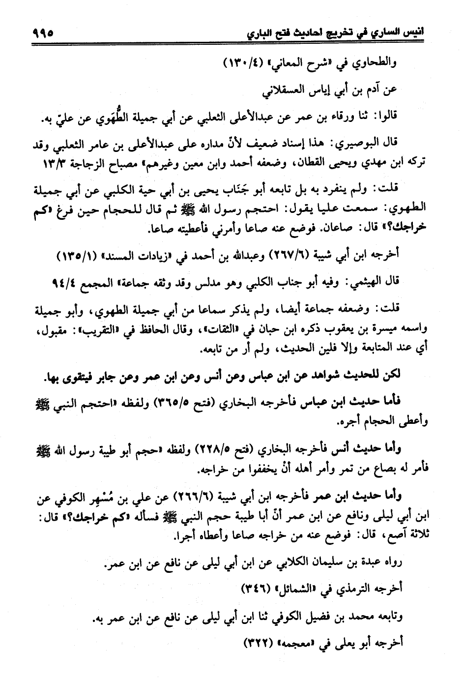 وأما حديث ابن عمر فأخرجه ابن أبي شيبة (6/ 266) عن علي بن مُسْهِر الكوفي عن ابن أبي ليلى ونافع عن ابن عمر أنْ أبا طيبة حجم النبي - صلى الله عليه وسلم - فسأله "كم خراجك؟ " قال: ثلاثة آصع، قال: فوضع عنه من خراجه صاعا وأعطاه أجرا.