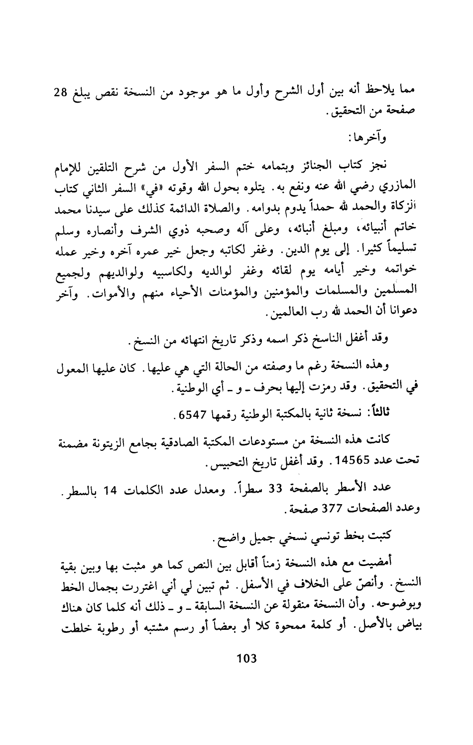مما يلاحظ أنه بين أول الشرح وأول ما هو موجود من النسخة نقص يبلغ 28 صفحة من التحقيق.