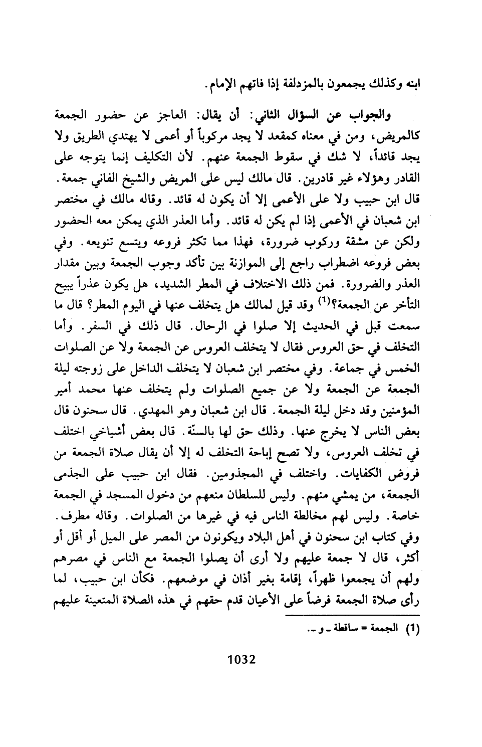 قال ابن حبيب ولا على الأعمى إلا أن يكون له قائد. وقاله مالك في مختصر ابن شعبان في الأعمى إذا لم يكن له قائد. وأما العذر الذي يمكن معه الحضور ولكن عن مشقة وركوب ضرورة، فهذا مما تكثر فروعه ويتسع تنويعه. وفي بعض فروعه اضطراب راجع إلى الموازنة بين تأكد وجوب الجمعة وبين مقدار العذر والضرورة. فمن ذلك الاختلاف في المطر الشديد، هل يكون عذرًا يحيى التأخر عن الجمعة؟ (¬1) وقد قيل لمالك هل يتخلف عنها في اليوم المطر؟ قال ما سمعت قبل في الحديث إلا صلوا في الرحال. قال ذلك في السفر. وأما التخلف في حق العروس فقال لا يتخلف العروس عن الجمعة ولا عن الصلوات الخمس في جماعة. وفي مختصر ابن شعبان لا يتخلف الداخل على زوجته ليلة الجمعة عن الجمعة ولا عن جميع الصلوات ولم يتخلف عنها محمَّد أمير المؤمنين وقد دخل ليلة الجمعة. قال ابن شعبان وهو المهدي. قال سحنون قال بعض الناس لا يخرج عنها. وذلك حق لها بالسنّة. قال بعض أشياخي اختلف في تخلف العروس، ولا تصح إباحة التخلف له إلا أن يقال صلاة الجمعة من فروض الكفايات. واختلف في المجذومين. فقال ابن حبيب على الجذمى الجمعة، من يمشي منهم. وليس للسلطان منعهم من دخول المسجد في الجمعة خاصة. وليس لهم مخالطة الناس فيه في غيرها من الصلوات. وقاله مطرف.