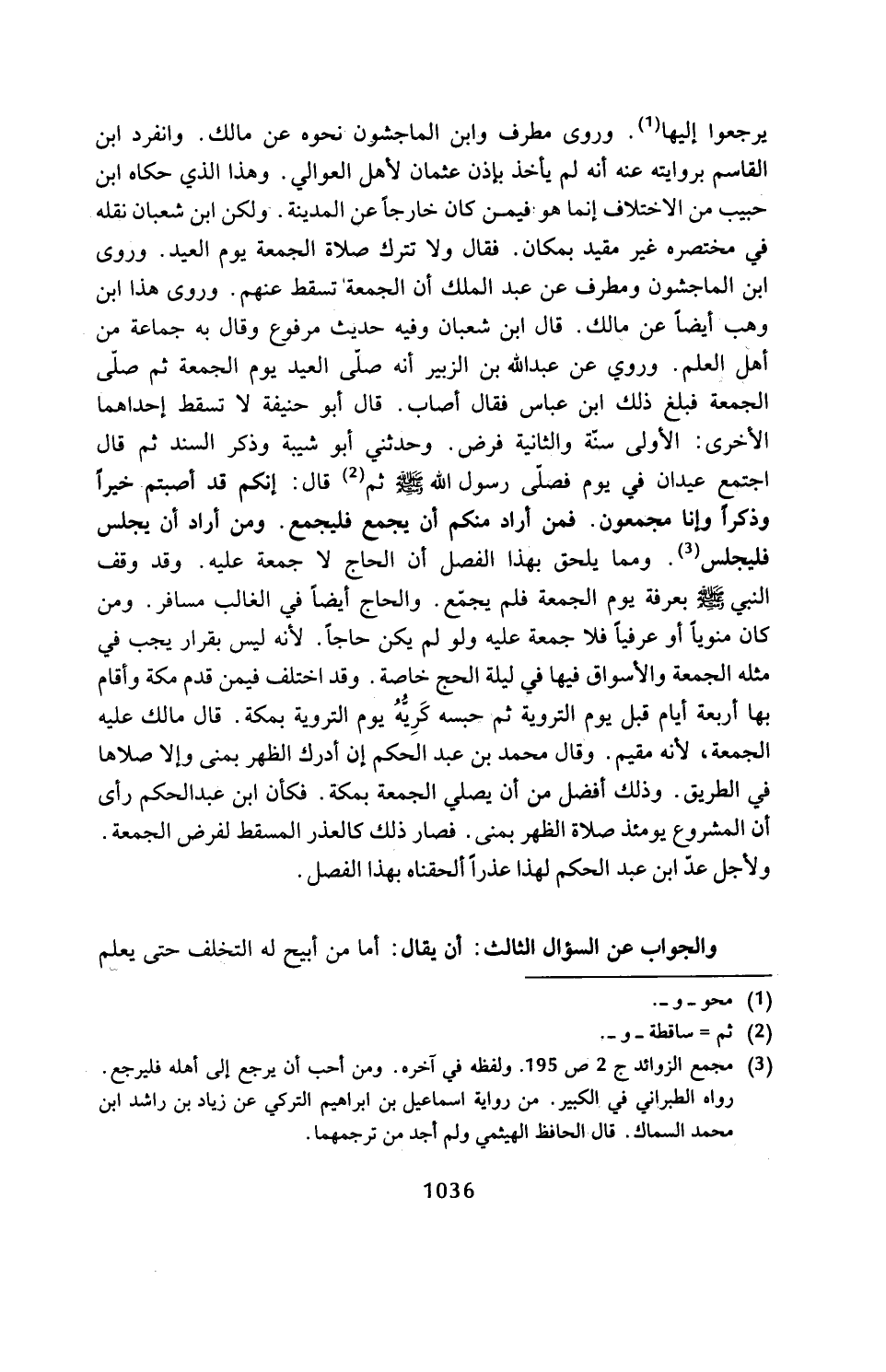 يرجعوا إليها (¬1). وروى مطرف وابن الماجشون نحوه عن مالك. وانفرد ابن القاسم بروايته عنه أنه لم يأخذ بإذن عثمان لأهل العوالي. وهذا الذي حكاه ابن حبيب من الاختلاف إنما هو. فيمن كان خارجًا عيق المدينة. ولكن ابن شعبان نقله في مختصره غير مقيد بمكان. فقال ولا تترك صلاة الجمعة يوم العيد. وروى ابن الماجشون ومطرف عن عبد الملك أن الجمعة تسقط عنهم. وروى هذا ابن وهب أيضًا عن مالك. قال ابن شعبان وفيه حديث مرفوع وقال به جماعة من أهل العلم. وروي عن عبد الله بن الزبير أنه صلّى العيد يوم الجمعة ثم صلى الجمعة فبلغ ذلك ابن عباس فقال أصاب. قال أبو حنيفة لا تسقط إحداهما الأخرى: الأولى سنة والثانية فرض. وحدثني أبو شيبة وذكر السند ثم قال اجتمع عيدان في يوم فصلَّى رسول الله - صلى الله عليه وسلم - ثم (¬2) قال: إنكم قد أصبتم- خيرًا وذكرًا وإنا مجمعون. فمن أراد منكم أن يجمع فليجمع. ومن أراد أن يجلس فليجلس (¬3). ومما يلحق بهذا الفصل أن الحاج لا جمعة عليه. وقد وقف النبي - صلى الله عليه وسلم - بعرفة يوم الجمعة فلم يجمّع. والحاج أيضًا في الغالب مسافر. ومن كان منويًا أو عرفيًا فلا جمعة عليه ولو لم يكن حاجًا. لأنه ليس بقرار يجب في مثله الجمعة والأسواق فيها في ليلة الحج خاصة. وقد اختلف فيمن قدم مكة وأقام بها أربعة أيام قبل يوم التروية ثم حبسه كَرِيُّهُ يوم التروية بمكة. قال مالك عليه الجمعة؛ لأنه مقيم. وقال محمَّد بن عبد الحكم إن أدرك الظهر بمنى وإلا صلاها في الطريق. وذلك أفضل من أن يصلي الجمعة بمكة. فكأن ابن عبد الحكم رأى أن المشروع يومئذ صلاة الظهر بمنى. فصار ذلك كالعذر المسقط لفرض الجمعة.
