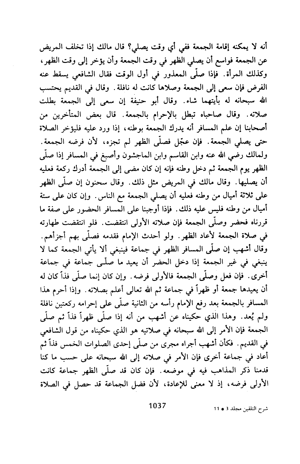أنه لا يمكنه إقامة الجمعة ففي أي وقت يصلي؟ قال مالك إذا تخلف المريض عن الجمعة فواسع أن يصلي الظهر في وقت الجمعة وأن يؤخر إلى وقت الظهر، وكذلك المرأة. فإذا صلى المعذور في أول الوقت فقال الشافعي يسقط عنه الفرض فإن سعى إلى الجمعة وصلاها كانت له نافلة. وقال في القديم يحتسب الله سبحانه له بايتهما شاء. وقال أبو حنيفة إن سعى إلى الجمعة بطلت صلاته. وقال صاحباه تبطل بالإحرام بالجمعة. قال بعض المتأخرين من أصحابنا إن علم المسافر أنه يدرك الجمعة بوطنه، إذا ورد عليه فليؤخر الصلاة حتى يصلي الجمعة. فإن عجل فصلى الظهر لم تجزه، لأن فرضه الجمعة.