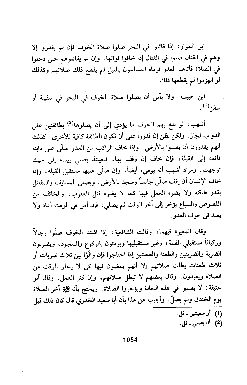 ابن حبيب: ولا بأس أن يصلوا صلاة الخوف في البحر في سفينة أو سفن (¬1).