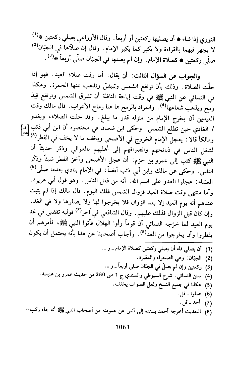 والجواب عن السؤال الثالث: أن يقال: أما وقت صلاة العيد. فهو إذا حلّت الصلاة. وذلك بأن ترتفع الشمس وتبيضّ وتذهب عنها العمرة. وهكذا في النسائي عن النبي - صلى الله عليه وسلم - في وقت إباحة النافلة أن تشرق الشمس وترتفع قيدَ رمح ويذهب شعاعها (¬4). والمراد بالرمح ها هنا رماح الأعراب. قال مالك وقت العيدين أن يخرج الإِمام من منزله قدر ما يبلغ. وقد حلت الصلاة، ويغدو الغادي حين تطلع الشمس. وحكى ابن شعبان في مختصره أن ابن أبي ذئب ومالكًا قالا: يعجل الإِمام الخروج في الأضحى ويخف ما لا يخف في الفطر (¬5) لشغل الناس في ذبائحهم وانصرافهم إلى أهليهم بالعوالي وذكر حديثًا أن النبي - صلى الله عليه وسلم - كتب إلى عمرو بن حزم: أن عجل الأضحى وأخرّ الفطر شيئًا وذكّر الناس. وحكى عن مالك وابن أبي ذئب أيضًا: في الإِمام ينادي بعد ما صلّى (¬6) العشاء: عجلوا الغدو على اسم الله: أنه من فعل الناس. وهو قول أبي هريرة.