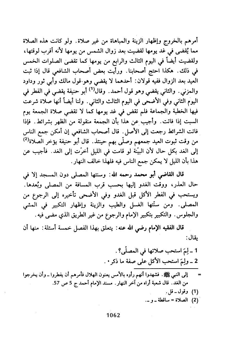 ويستحب في الفطر الأكل قبل الغدو وفي الأضحى تأخيره إلى الرجوع من المصلى. ومن سنتها الغسل والطيب والزينة وإظهار التكبير في المشي والجلوس. والتكبير بتكبير الإِمام والرجوع من غير الطريق الذي مضى فيه.