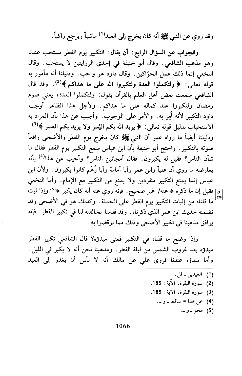 والجواب عن السؤال الرابع: أن يقال: التكبير يوم الفطر مستحب عندنا وهو مذهب الشافعي. وقال أبو حنيفة في إحدى الروايتين لا يستحب. وقال النخعي إنما ذلك عمل الحوّاكين. وقال داود هو واجب. ودليلنا أنه مأمور به قوله تعالى: {وَلِتُكْمِلُوا الْعِدَّةَ وَلِتُكَبِّرُوا اللَّهَ عَلَى مَا هَدَاكُمْ} (¬2). وقد قال الشافعي سمعت بعض أهل العلم بالقرآن يقول: ولتكملوا العدة، يعني صوم رمضان ولتكبروا عند كماله على ما هداكم. ولأجل هذا الظاهر أوجب داود التكبير لأنه أُمِر به. والأمر على الوجوب. وأجيب عن هذا بأن المراد به الاستحباب بدليل قوله تعالى: {يُرِيدُ اللَّهُ بِكُمُ الْيُسْرَ وَلَا يُرِيدُ بِكُمُ الْعُسْرَ} (¬3). ودليلنا أيضًا ما رواه عمر أن النبي - صلى الله عليه وسلم - كان يخرج يوم الفطر والأضحى رافعًا صوته بالتكبير. واحتج أبو حنيفة بأن ابن عباس سمع التكبير يوم الفطر فقال ما شأن الناس؟ فقيل له يكبرون. فقال أمجانين الناس؟ وأجيب عن هذا (¬4) بأنه يعارضه ما روي أن عليًا وابن عمر وأبا أمامة وأبا رُهْم كانوا يكبرون. ولأن ابن عباس إنما يمنع التكبير منفردين ولا يمنع من التكبير مع الإِمام. وأما النخعي فقيل إن ما ذكره *عنه غير صحيح. فإنه روي عنه أنه كان يكبر* (¬5) وإذا ثبت ما قلناه من إثبات التكبير يوم الفطر على الجملة. وكذلك هو في الأضحى وقد تضمنه حديث ابن عمر الذي ذكرناه. وقد قدمنا مخالفته لنا في تكبير الفطر. فإنه يوافق مذهبنا في تكبير الأضحى وذلك مما نوقضوا به.