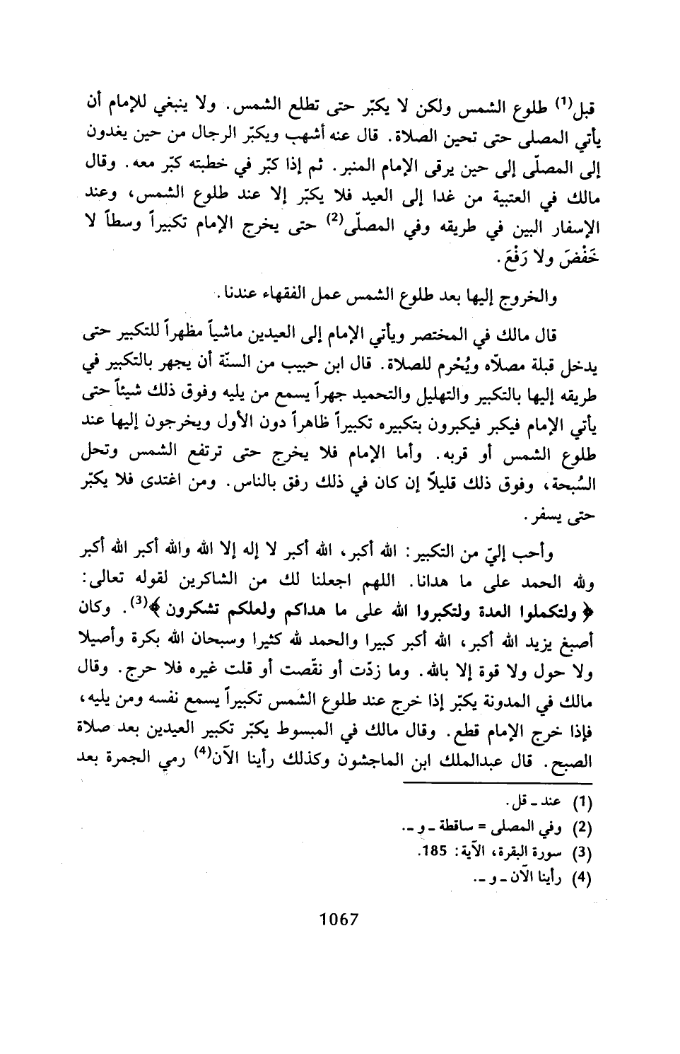 وأحب إليّ من التكبير: الله أكبر، الله أكبر لا إله إلا الله والله أكبر الله أكبر ولله الحمد على ما هدانا. اللهم اجعلنا لك من الشاكرين لقوله تعالى: {وَلِتُكْمِلُوا الْعِدَّةَ وَلِتُكَبِّرُوا اللهَ عَلَى مَا هَدَاكُمْ وَلَعَلَّكُمْ تَشْكُرُونَ (185)} (¬3). وكان أصبغ يزيد الله أكبر، الله أكبر كبيرا والحمد لله كثيرا وسبحان الله بكرة وأصيلا ولا حول ولا قوة إلا بالله. وما زدّت أو نقّصت أو قلت غيره فلا حرج. وقال مالك في المدونة يكبّر إذا خرج عند طلوع الشَمس تكبيرًا يسمع نفسه ومن يليه، فإذا خرج الإِمام قطع. وقال مالك في المبسوط يكبّر تكبير العيدين بعد صلاة الصبح. قال عبد الملك ابن الماجشون وكذلك رأينا الآن (¬4) رمي الجمرة بعد