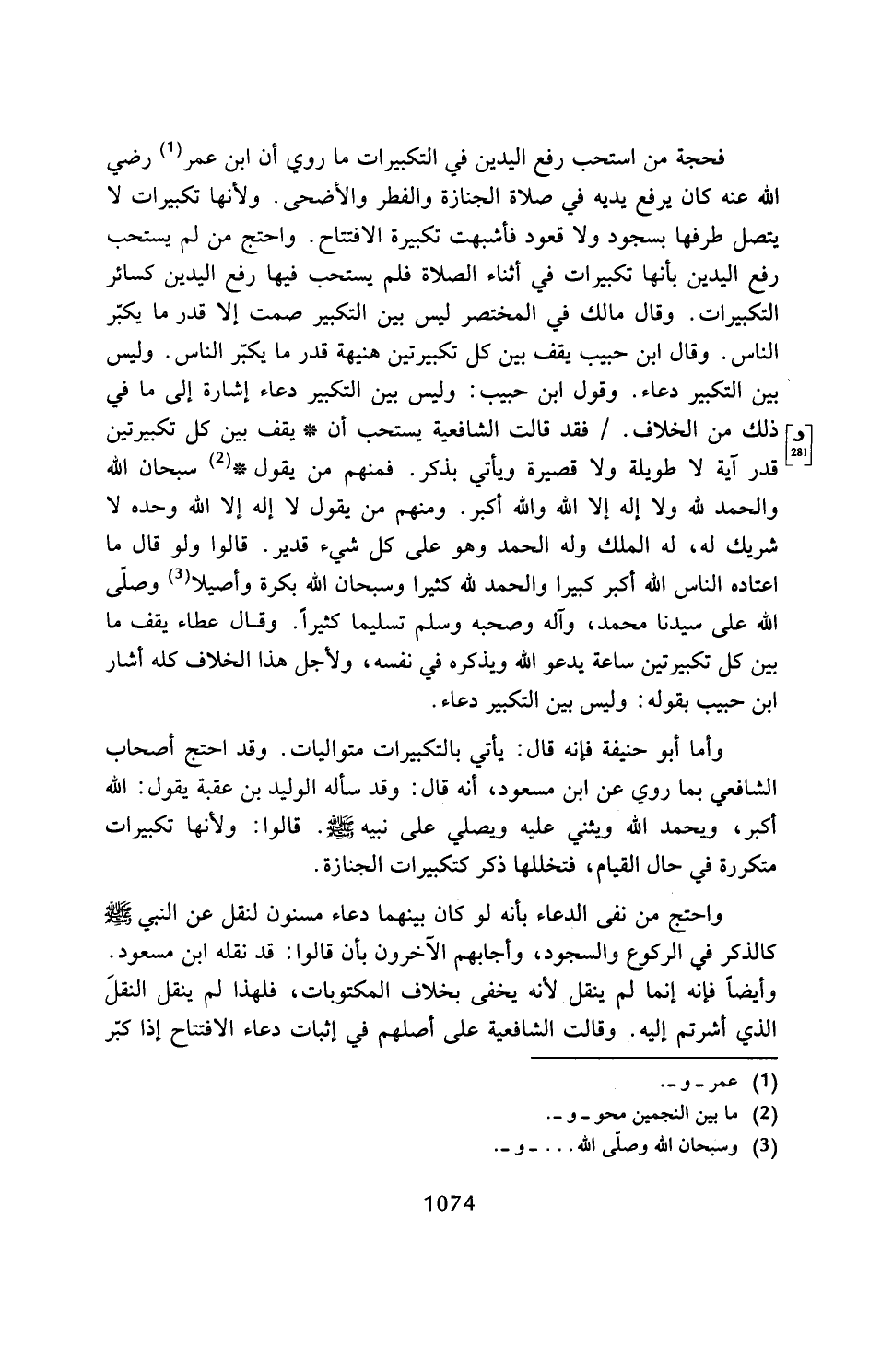 الشافعي بما روي عن ابن مسعود، أنه قال: وقد سأله الوليد بن عقبة يقول: الله أكبر، ويحمد الله ويثني عليه ويصلي على نبيه - صلى الله عليه وسلم -. قالوا: ولأنها تكبيرات متكررة في حال القيام، فتخللها ذكر كتكبيرات الجنازة. واحتج من نفى الدعاء بأنه لو كان بينهما دعاء مسنون لنقل عن النبي - صلى الله عليه وسلم - كالذكر في الركوع والسجود، وأجابهم الآخرون بأن قالوا: قد نقله ابن مسعود.