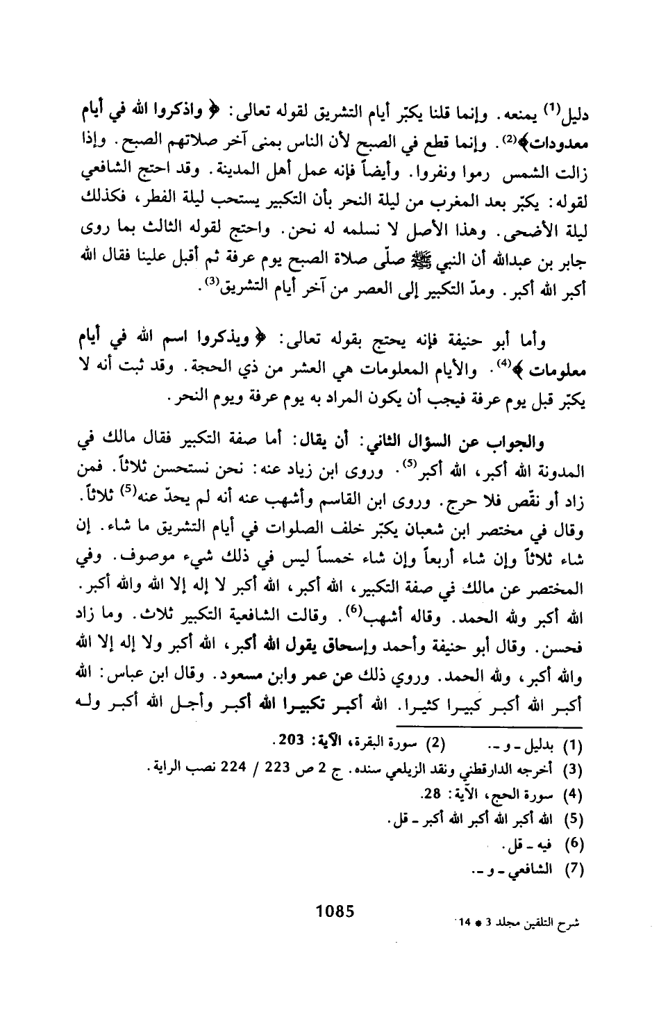 وأما أبو حنيفة فإنه يحتج بقوله تعالى: {وَيَذْكُرُوا اسْمَ اللَّهِ فِي أَيَّامٍ مَعْلُومَاتٍ} (¬4). والأيام المعلومات هي العشر من ذي الحجة. وقد ثبت أنه لا يكبّر قبل يوم عرفة فيجب أن يكون المراد به يوم عرفة ويوم النحر.