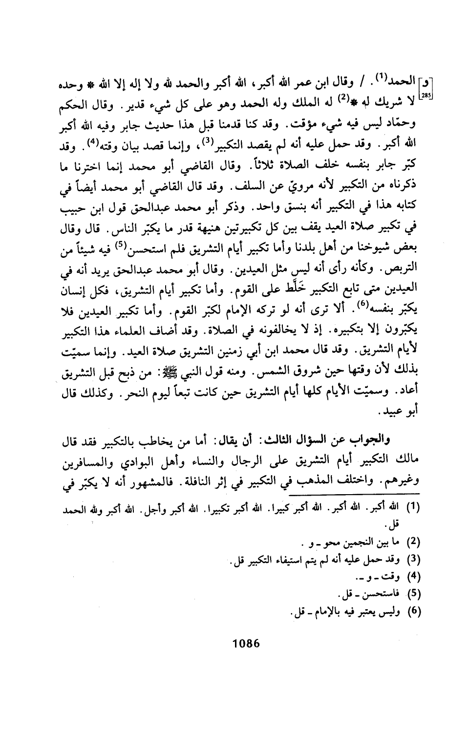 والجواب عن السؤال الثالث: أن يقال: أما من يخاطب بالتكبير فقد قال مالك التكبير أيام التشريق على الرجال والنساء وأهل البوادي والمسافرين وغيرهم. واختلف المذهب في التكبير في إثر النافلة. فالمشهور أنه لا يكبّر في