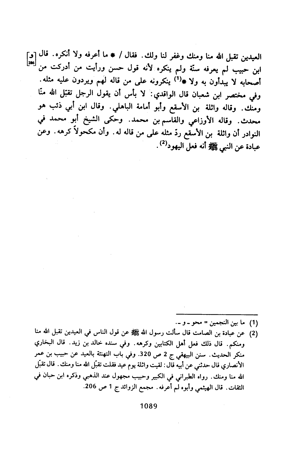 (¬2) عن عبادة بن الصامت قال سألت رسول الله - صلى الله عليه وسلم - عن قول الناس في العيدين تقبل الله منا ومنكم. قال ذلك فعل أهل الكتابين وكرهه. وفي سنده خالد بن زيد. قال البخاري منكر الحديث. سنن البيهقي ج 2 ص 320 وفي باب التهنئة بالعيد عن حبيب بن عمر الأنصاري قال حدثني عن أبيه قال: لقيت واثلة يوم عيد فقلت تقبل الله منا ومنك. قال تقبّل الله منا ومنك. رواه الطبراني في الكبير وحبيب مجهول عند الذهبي وذكره ابن حبان في الثقات. قال الهيثمي وأبوه لم أعرفه. مجمع الزوائد ج 1 ص 206.