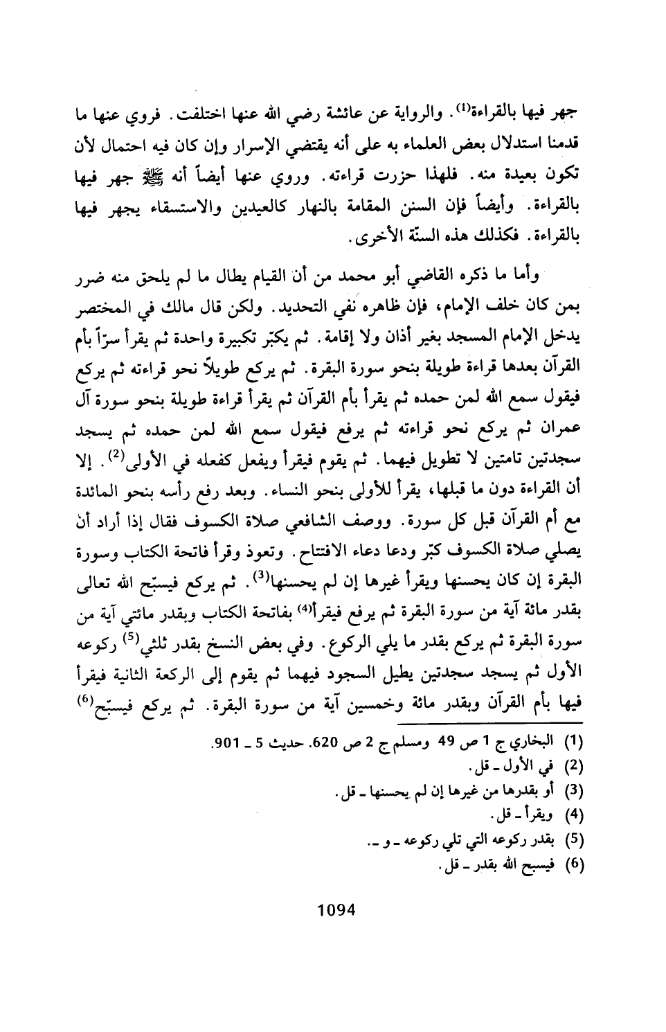 وأما ما ذكره القاضي أبو محمَّد من أن القيام يطال ما لم يلحق منه ضرر بمن كان خلف الإِمام، فإن ظاهره نفي التحديد. ولكن قال مالك في المختصر يدخل الإِمام المسجد بغير أذان ولا إقامة. ثم يكبّر تكبيرة واحدة ثم يقرأ سرًّا بأم القرآن بعدها قراءة طويلة بنحو سورة البقرة. ثم يركع طويلًا نحو قراءته ثم يركع فيقول سمع الله لمن حمده ثم يقرأ بأم القرآن ثم يقرأ قراءة طويلة بنحو سورة آل عمران ثم يركع نحو قراءته ثم يرفع فيقول سمع الله لمن حمده ثم يسجد سجدتين تامتين لا تطويل فيهما. ثم يقوم فيقرأ ويفعل كفعله في الأولى (¬2). إلا أن القراءة دوك ما قبلها، يقرأ للأولى بنحو النساء. وبعد رفع رأسه بنحو المائدة مع أم القرآن قبل كل سورة. ووصف الشافعي صلاة الكسوف فقال إذا أراد أن يصلي صلاة الكسوف كبّر ودعا دعاء الافتتاح. وتعوذ وقرأ فاتحة الكتاب وسورة البقرة إن كان يحسنها ويقرأ غيرها إن لم يحسنها (¬3). ثم يركع فيسبّح الله تعالى بقدر مائة آية من سورة البقرة ثم يرفع فيقرأ (¬4) بفاتحة الكتاب وبقدر مائتي آية من سورة البقرة ثم يركع بقدر ما يلي الركوع. وفي بعض النسخ بقدر ثلثي (¬5) ركوعه الأول ثم يسجد سجدتين يطيل السجود فيهما ثم يقوم إلى الركعة الثانية فيقرأ فيها بأم القرآن وبقدر مائة وخمسين آية من سورة البقرة. ثم يركع فيسبّح (¬6)