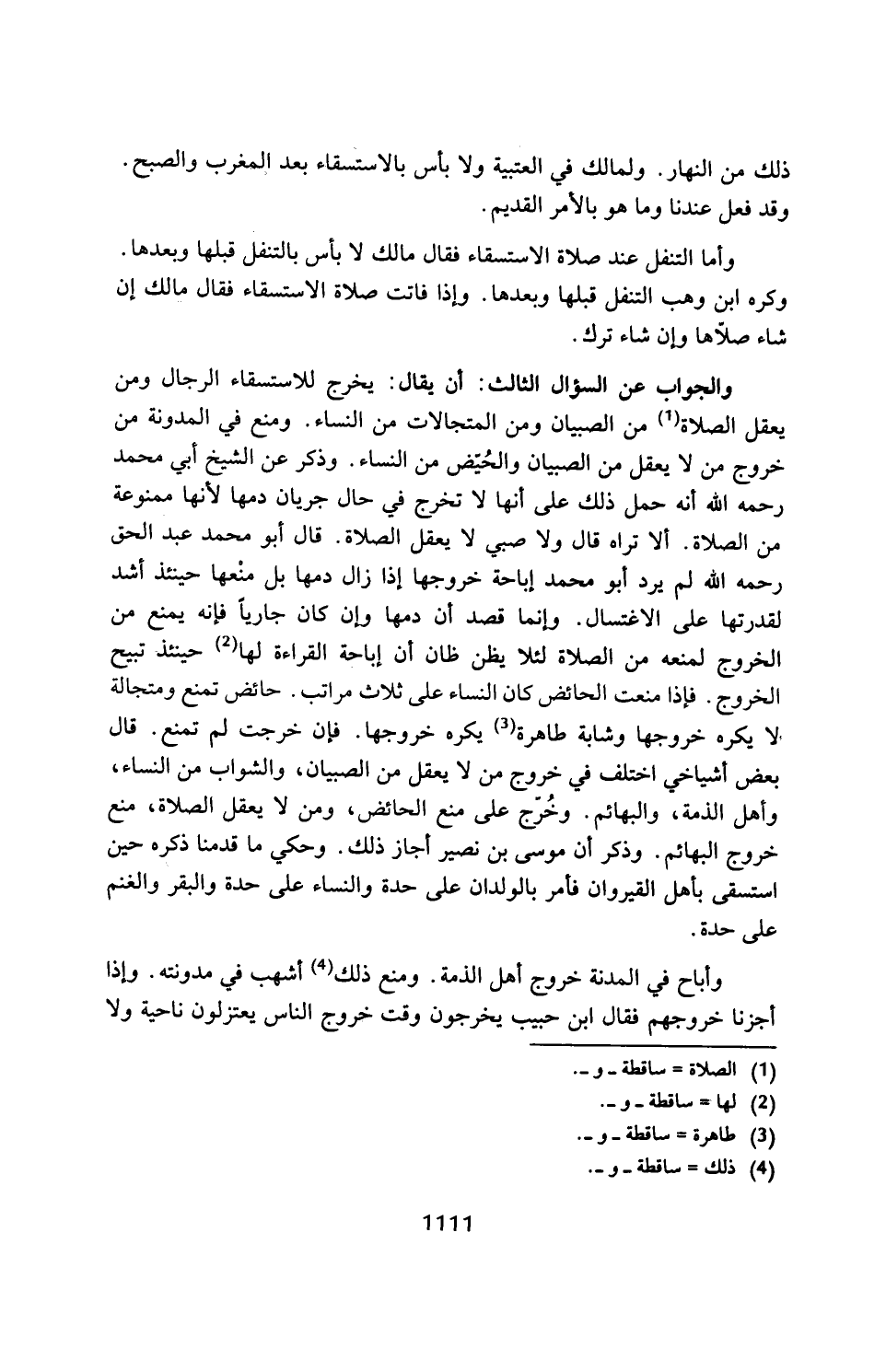 والجواب عن السؤال الثالث: أن يقال: يخرج للاستسقاء الرجال ومن يعقل الصلاة (¬1) من الصبيان ومن المتجالات من النساء. ومنع في المدونة من خروج من لا يعقل من الصبيان والحُيّض من النساء. وذكر عن الشيخ أبي محمَّد رحمه الله أنه حمل ذلك على أنها لا تخرج في حال جريان دمها لأنها ممنوعة من الصلاة. ألا تراه قال ولا صبي لا يعقل الصلاة. قال أبو محمَّد عبد الحق رحمه الله لم يرد أبو محمَّد إباحة خروجها إذا زال دمها بل منْعها حينئذ أشد لقدرتها على الاغتسال. وإنما قصد أن دمها وإن كان جاريًا فإنه يمنع من الخروج لمنعه من الصلاة لئلا يظن ظان أن إباحة القراءة لها (¬2) حينئذ تبيح الخروج. فإذا منعت الحائض كان النساء على ثلاث مراتب. حائض تمنع ومتجالة لا يكره خروجها وشابة طاهرة (¬3) يكره خروجها. فإن خرجت لم تمنع. قال بعض أشياخي اختلف في خروج من لا يعقل من الصبيان، والشواب من النساء، وأهل الذمة، والبهائم. وخُرّج على منع الحائض، ومن لا يعقل الصلاة، منع خروج البهائم. وذكر أن موسى بن نصير أجاز ذلك. وحكي ما قدمنا ذكره حين استسقى بأهل القيروان فأمر بالولدان على حدة والنساء على حدة والبقر والغنم على حدة.