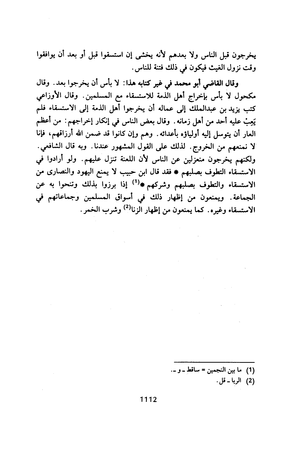 ولكنهم يخرجون منعزلين عن الناس لأن اللعنة تنزل عليهم. ولو أرادوا في الاستسقاء التطوف بصلبهم *فقد قال ابن حبيب لا يمنع اليهود والنصارى من الاستسقاء والتطوف بصلبهم وشركهم* (¬1) إذا برزوا بذلك وتنحوا به عن الجماعة. ويمنعون من إظهار ذلك في أسواق المسلمين وجماعاتهم في الاستسقاء وغيره. كما يمنعون من إظهار الزنا (¬2) وشرب الخمر.