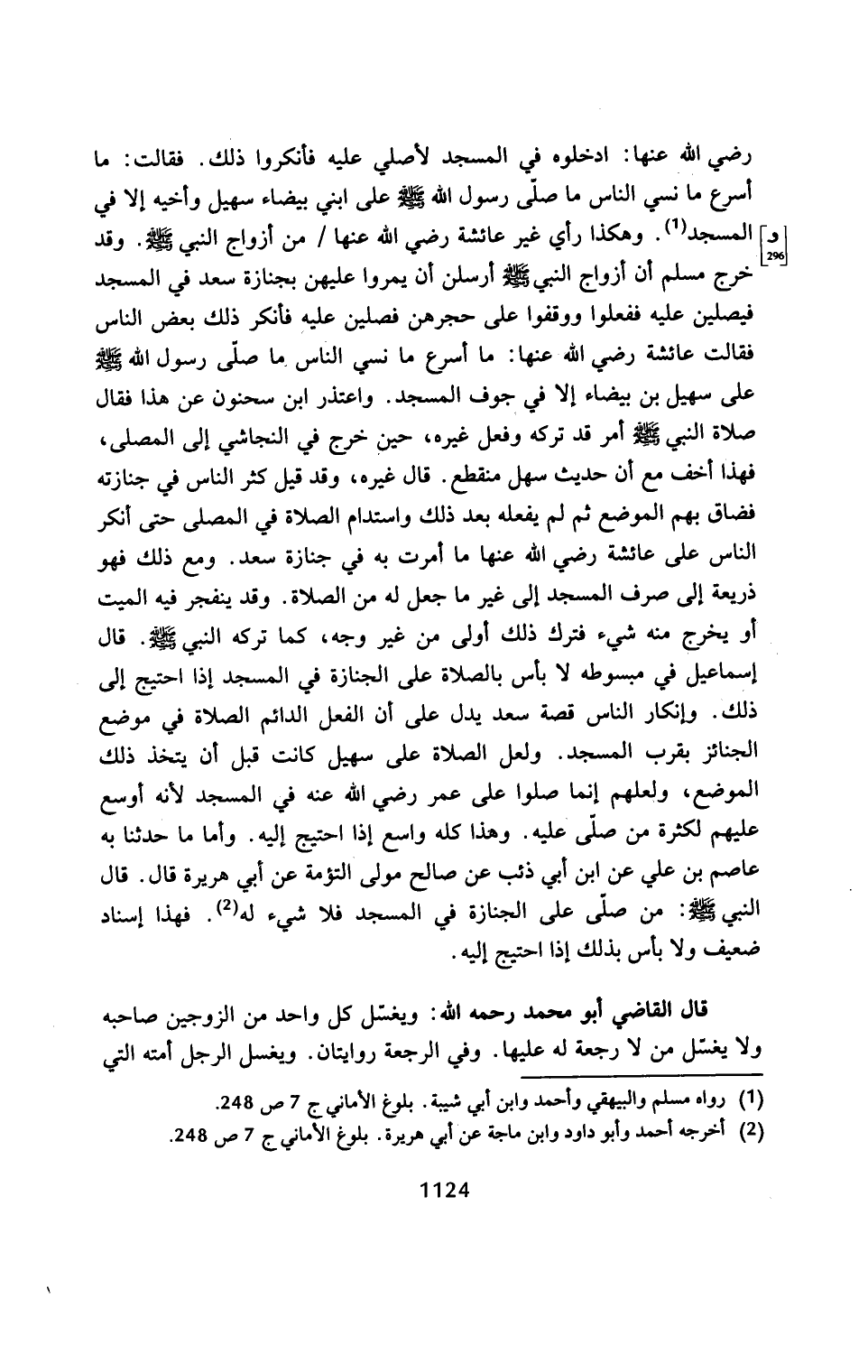 رضي الله عنها: ادخلوه في المسجد لأصلي عليه فأنكروا ذلك. فقالت: ما أسرع ما نسي الناس ما صلى رسول الله - صلى الله عليه وسلم - على ابني بيضاء سهيل وأخيه إلا في المسجد (¬1). وهكذا رأي غير عائشة رضي الله عنها من أزواج النبي - صلى الله عليه وسلم -. وقد خرج مسلم أن أزواج النبي - صلى الله عليه وسلم - أرسلن أن يمروا عليهن بجنازة سعد في المسجد فيصلين عليه ففعلوا ووقفوا على حجرهن فصلين عليه فأنكر ذلك بعض الناس فقالت عائشة رضي الله عنها: ما أسرع ما نسي الناس ما صلى رسول الله - صلى الله عليه وسلم - على سهيل بن بيضاء إلا في جوف المسجد. واعتذر ابن سحنون عن هذا فقال صلاة النبي - صلى الله عليه وسلم - أمر قد تركه وفعل غيره، حين خرج في النجاشي إلى المصلى، فهذا أخف مع أن حديث سهل منقطع. قال غيره، وقد قيل كثر الناس في جنازته فضاق بهم الموضع ثم لم يفعله بعد ذلك واستدام الصلاة في المصلى حتى أنكر الناس على عائشة رضي الله عنها ما أمرت به في جنازة سعد. ومع ذلك فهو ذريعة إلى صرف المسجد إلى غير ما جعل له من الصلاة. وقد ينفجر فيه الميت أو يخرج منه شيء فترك ذلك أولى من غير وجه، كما تركه النبي - صلى الله عليه وسلم -. قال إسماعيل في مبسوطه لا بأس بالصلاة على الجنازة في المسجد إذا احتيج إلى ذلك. وإنكار الناس قصة سعد يدل على أن الفعل الدائم الصلاة في موضع الجنائز بقرب المسجد. ولعل الصلاة على سهيل كانت قبل أن يتخذ ذلك الموضع، ولعلهم إنما صلوا على عمر رضي الله عنه في المسجد لأنه أوسع عليهم لكثرة من صلى عليه. وهذا كله واسع إذا احتيج إليه. وأما ما حدثنا به عاصم بن علي عن ابن أبي ذئب عن صالح مولى التؤمة عن أبي هريرة قال. قال النبي - صلى الله عليه وسلم -: من صلّى على الجنازة في المسجد فلا شيء له (¬2). فهذا إسناد ضعيف ولا بأس بذلك إذا احتيج إليه.